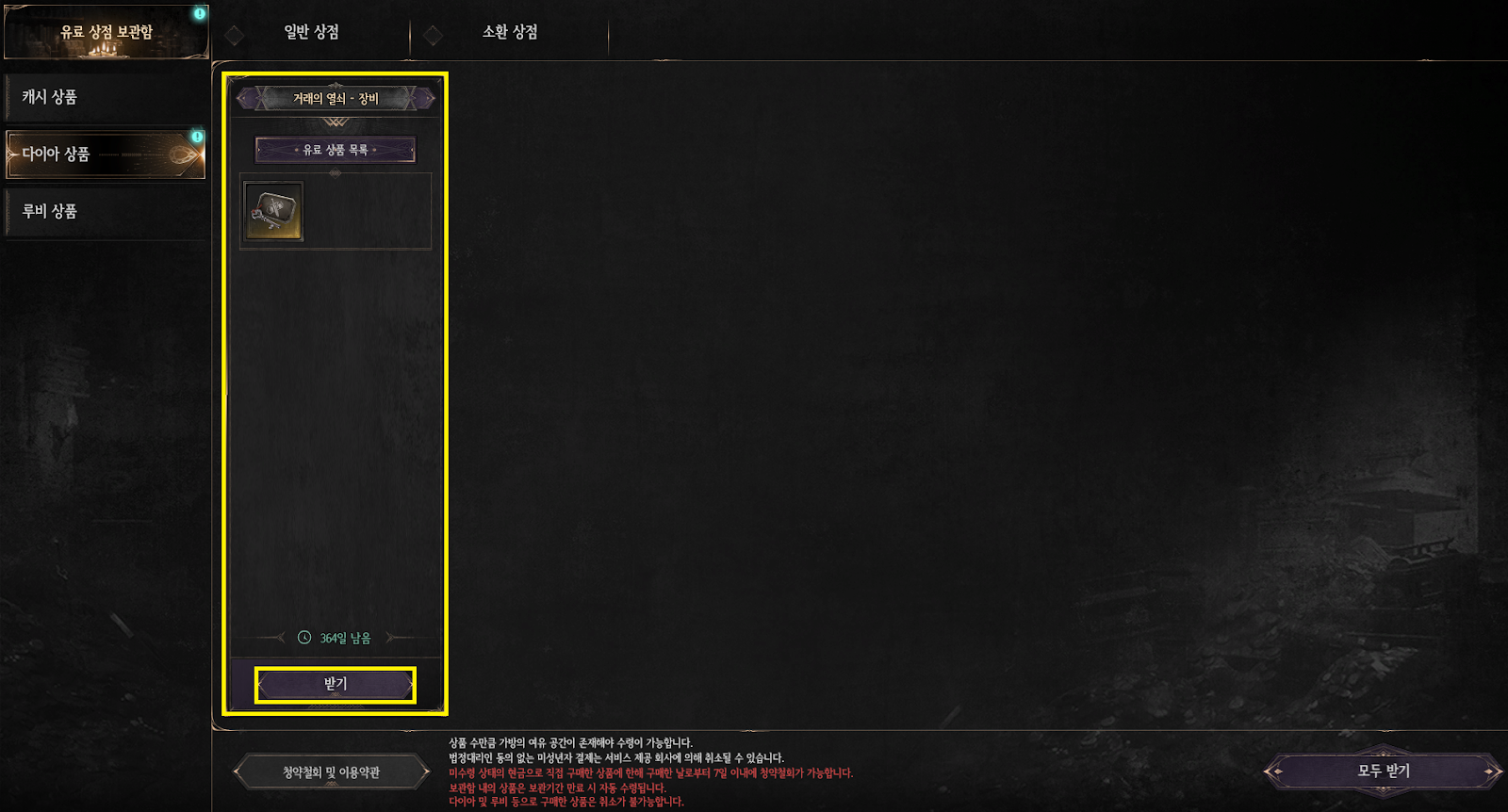 - 유료 상점 보관함에서 결제한 유형 (캐시/다이아/루비)에 따라 상품 탭을 클릭 후 구매한 상품 하단의 ‘받기’를 클릭하면 최종적으로 아이템을 수령할 수 있습니다.