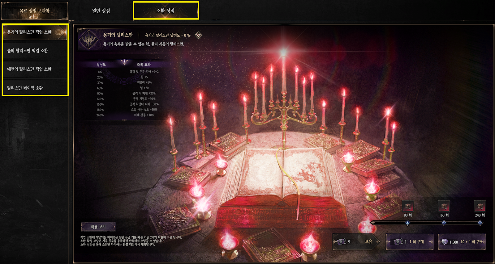 - 소환 상점에서는 소환을 통해 탈리스만을 획득할 수 있습니다.
