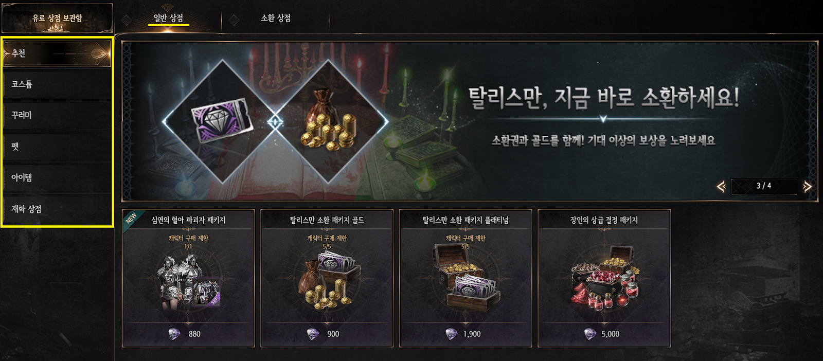 - 일반 상점은 코스튬, 꾸러미, 펫 아이템 등 유료 상점 내 주요 상품들을 확인할 수 있습니다.