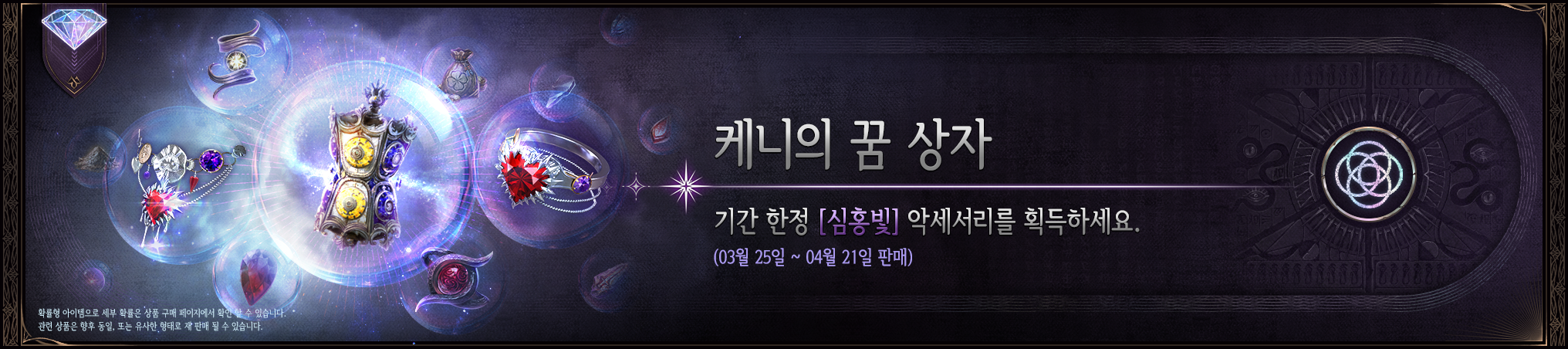 - 케니의 꿈 상자에서 장신구를 비롯한 여러 아이템 중 랜덤하게 하나를 획득하실 수 있습니다.