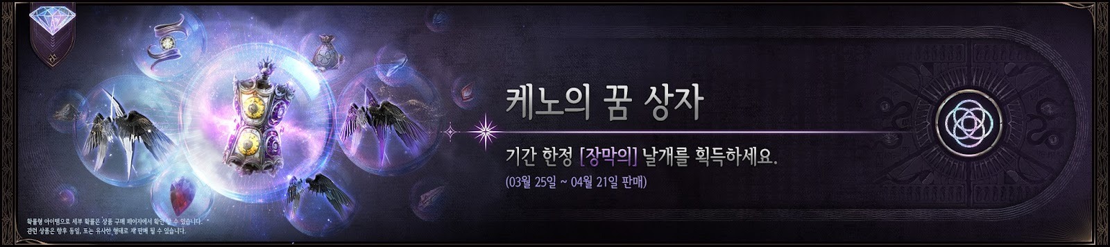 - 케노의 꿈 상자에서 날개를 비롯한 여러 아이템 중 랜덤하게 하나를 획득하실 수 있습니다.