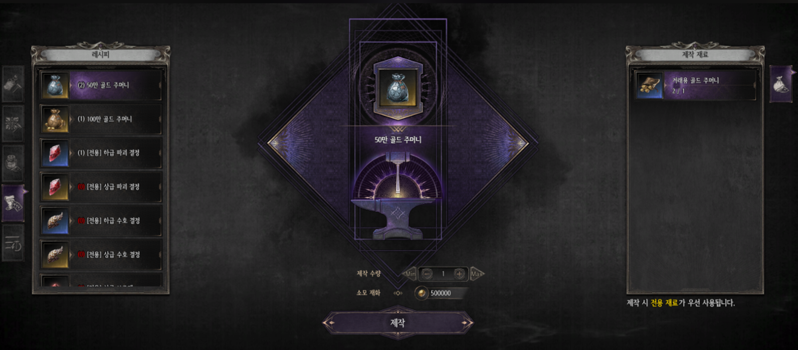 → 제작 가능한 골드 주머니는, 50만 골드 주머니, 100만 골드 주머니 2종이 있습니다.