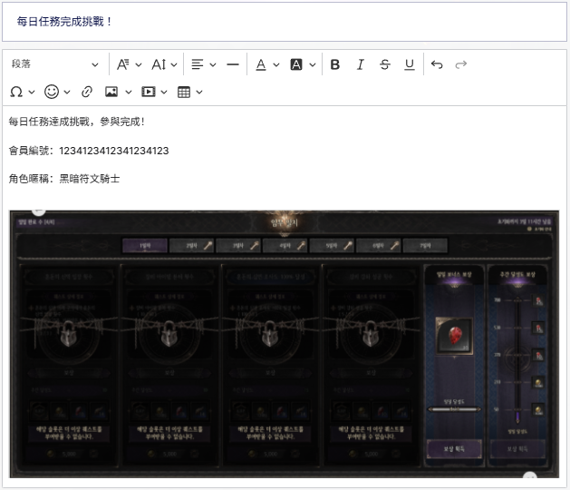 2) 前往官方社群【每日任務達成挑戰】版面,上傳截圖,並填寫完成任務角色的會員編號與角色名稱後送出。