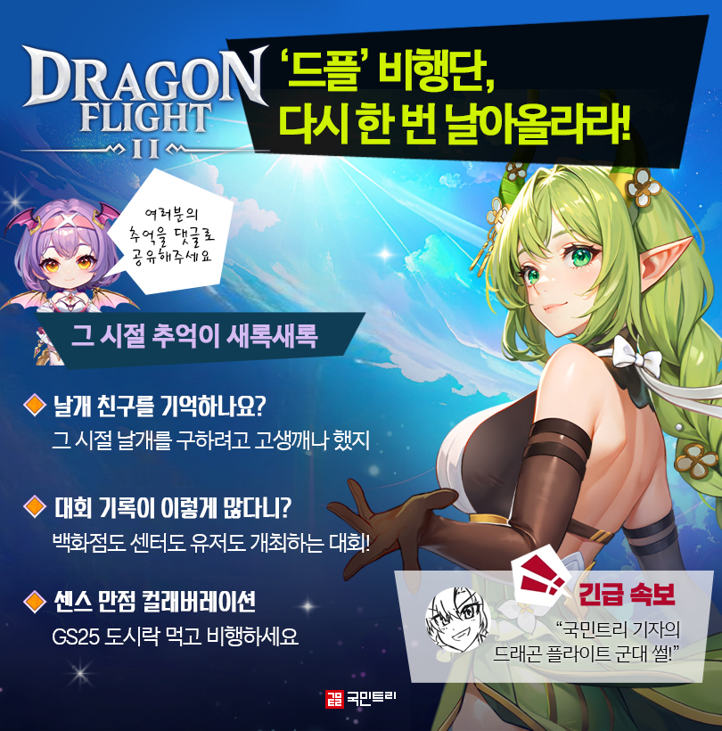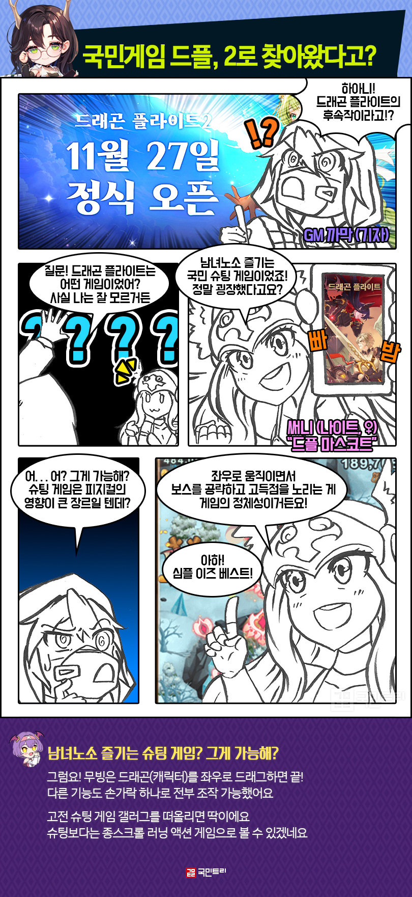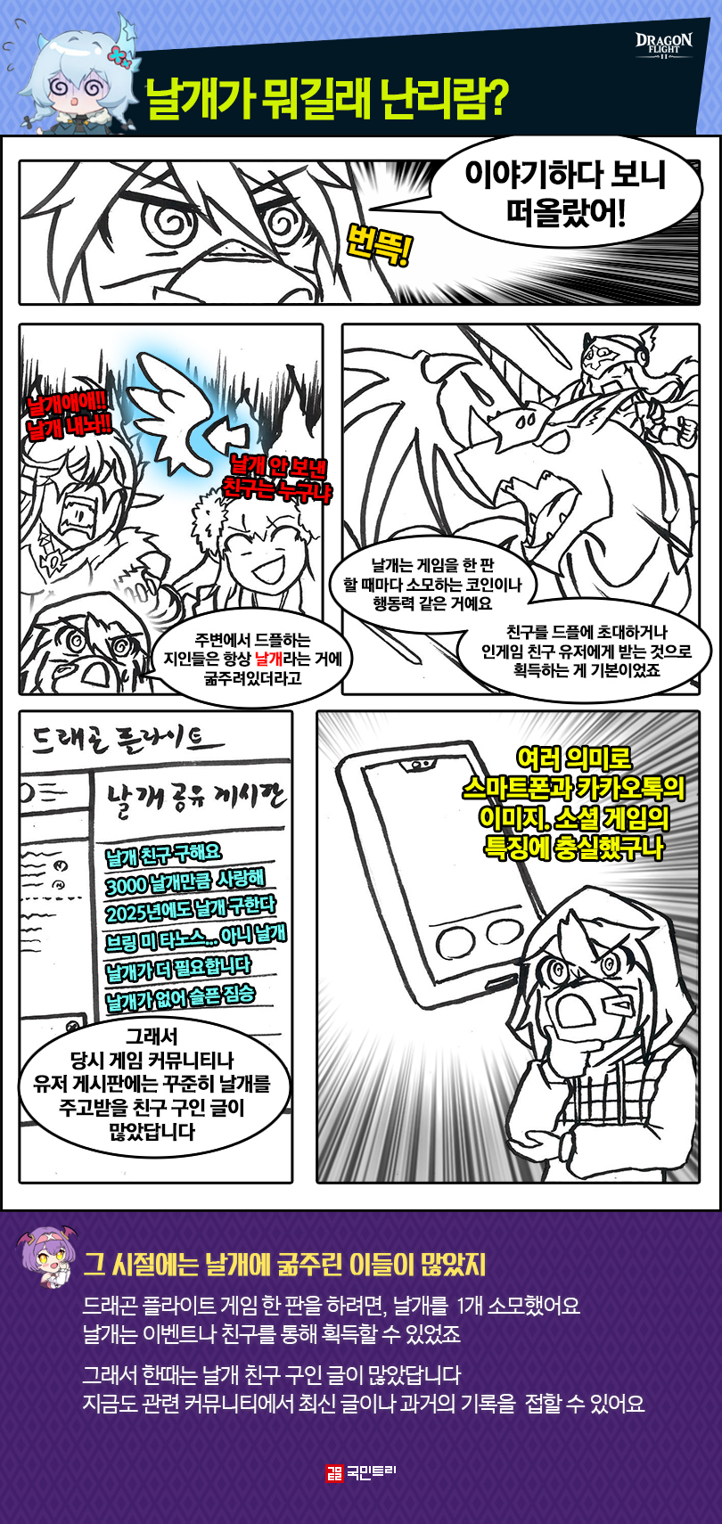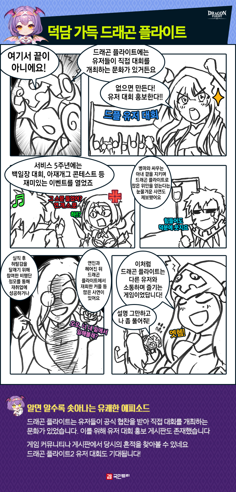 전작 드래곤 플라이트는 명성을 떨친 게임입니다. 신작을 통해 시리즈에 입문한 드래곤 플라이트2 유저라면, 그 시절의 추억을 좀처럼 알아채기 못할 거 같다는 생각이 들더군요. 이에 드래곤 플라이트2 국민트리가 컷툰을 준비했습니다. 만화를 통해 그 시절 유저들의 마음을 움직였던 향수를 느껴보세요. 전작을 즐긴 유저라면, 댓글을 통해 추억을 공유해주세요. 즐거운 기억은 나눌수록 배가 되니까요!