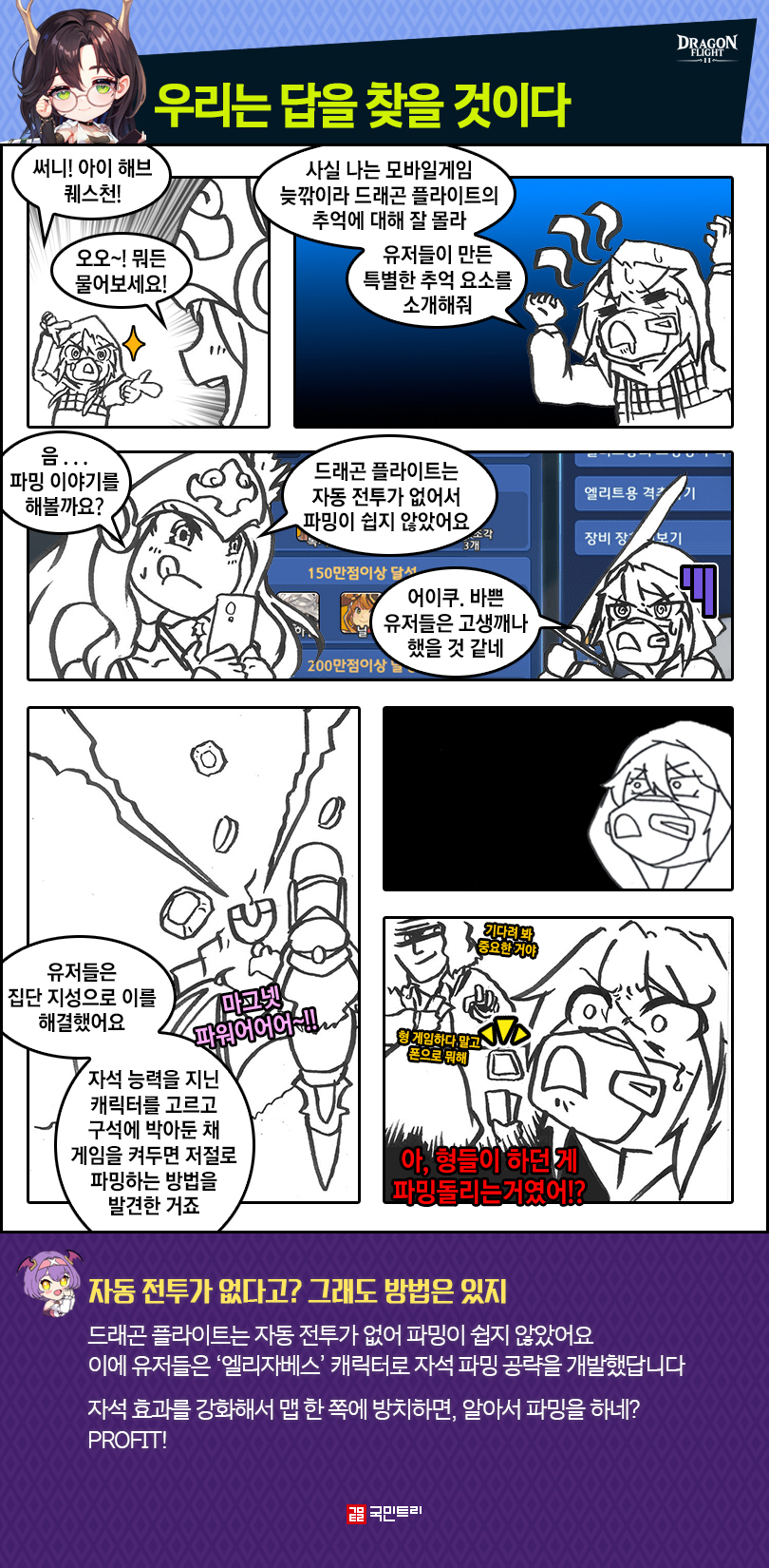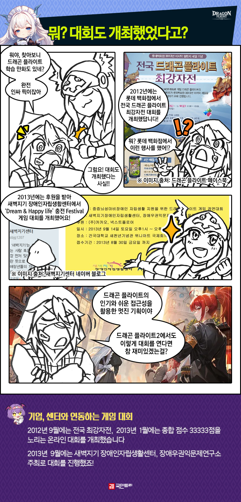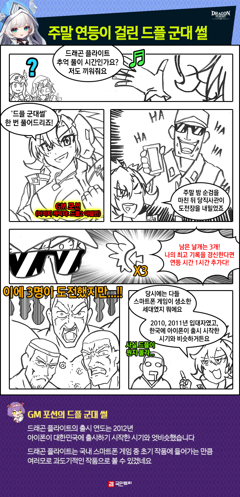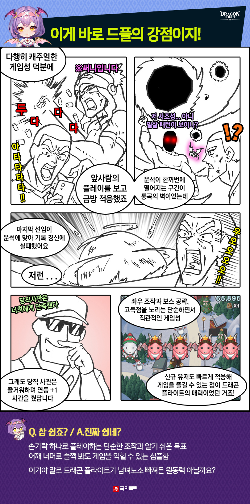 전작 드래곤 플라이트는 명성을 떨친 게임입니다. 신작을 통해 시리즈에 입문한 드래곤 플라이트2 유저라면, 그 시절의 추억을 좀처럼 알아채기 못할 거 같다는 생각이 들더군요. 이에 드래곤 플라이트2 국민트리가 컷툰을 준비했습니다. 만화를 통해 그 시절 유저들의 마음을 움직였던 향수를 느껴보세요. 전작을 즐긴 유저라면, 댓글을 통해 추억을 공유해주세요. 즐거운 기억은 나눌수록 배가 되니까요!