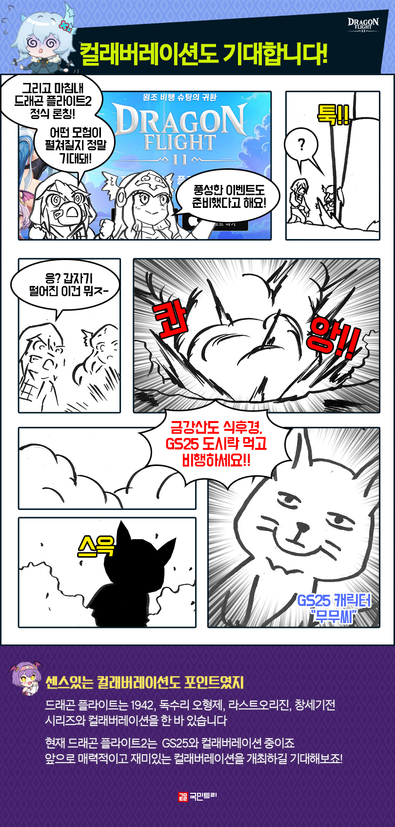 플레이위드코리아의 신작 '드래곤 플라이트2'가 11월 27일 정식 론칭했습니다. 2012년 출시해 국민 게임으로 큰 인기를 끌었던 '드래곤 플라이트'의 후속작이죠. 이번 작품에서는 다양한 미소녀 드래곤을 조종해 슈팅 액션을 즐길 수 있습니다. 오픈과 함께 풍성한 이벤트와 GS25 편의점 컬래버레이션을 진행 중이니 놓치지 말고 참여하세요.