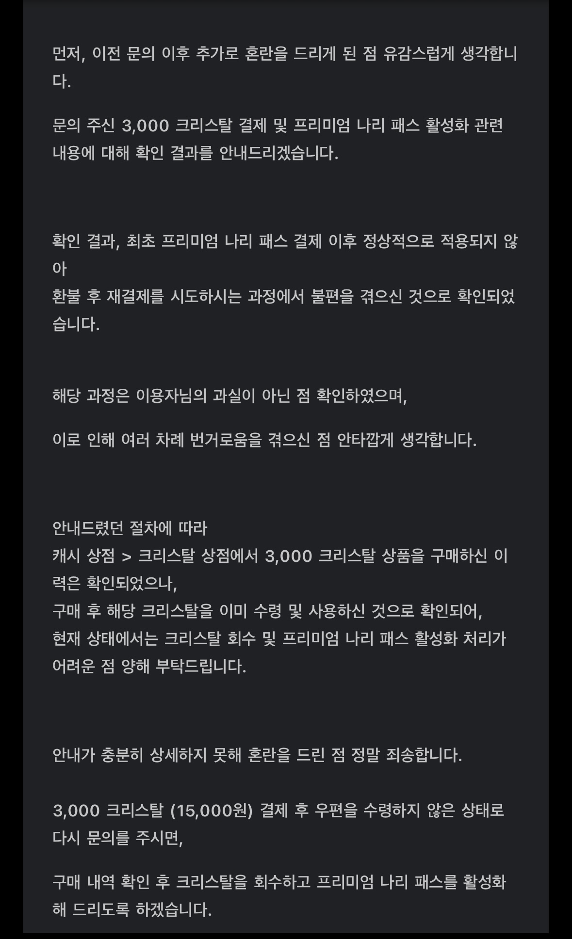 이미 15000원 결제했다가 게임오류때문에 직접 환불받고 3000크리스탈 사라해서 초회도아니고 그냥 3000크리스탈 샀는데 미리 말해주지도않은내용으로 결제 한번 더 요구하는게 맞냐
