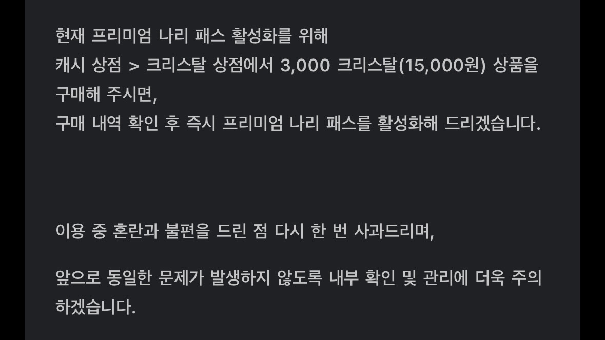 그랬더니 3000크리스탈 구매하면 “구매내역확인후 즉시 활성화해주겠다”는 답변이옴