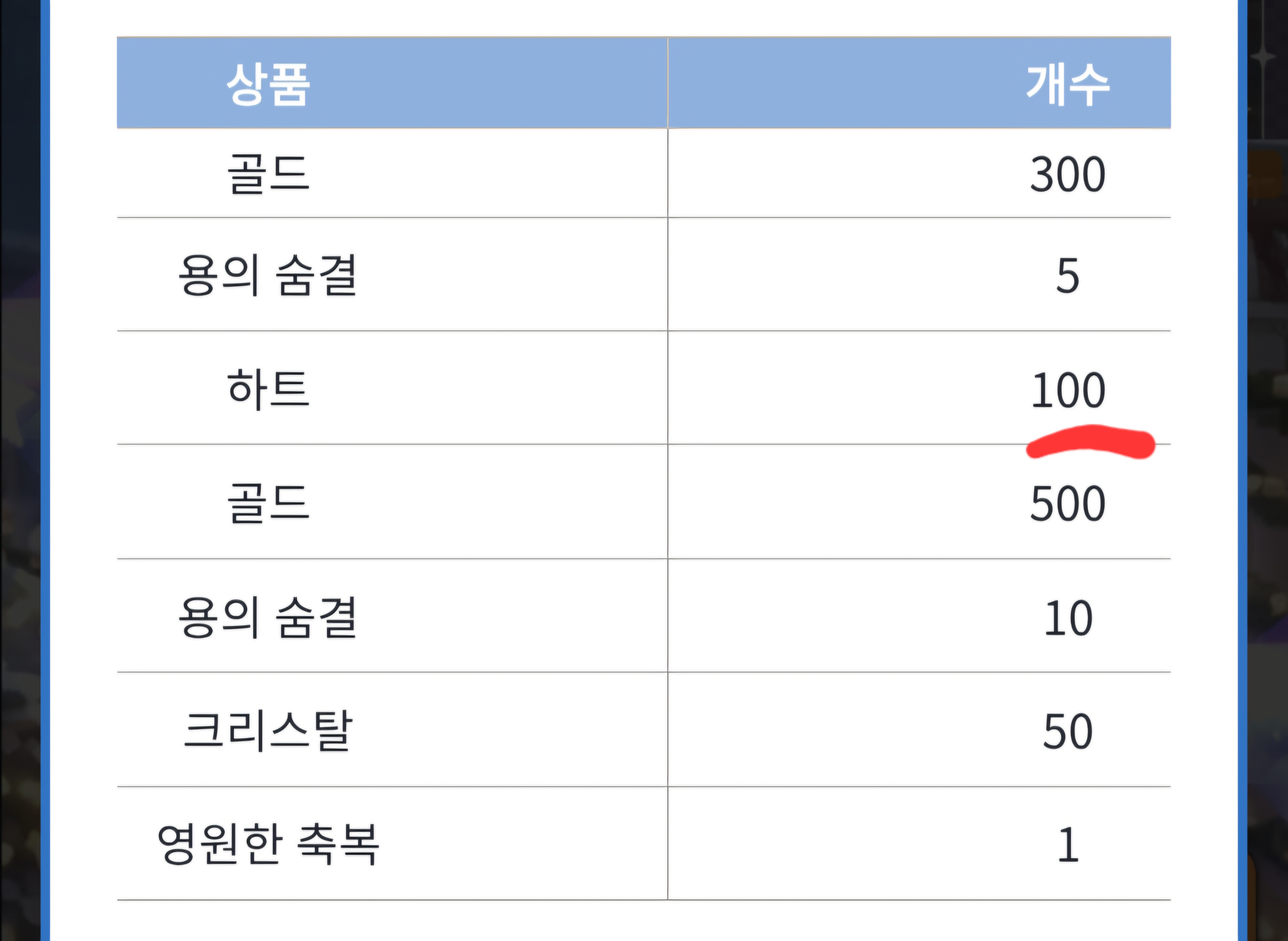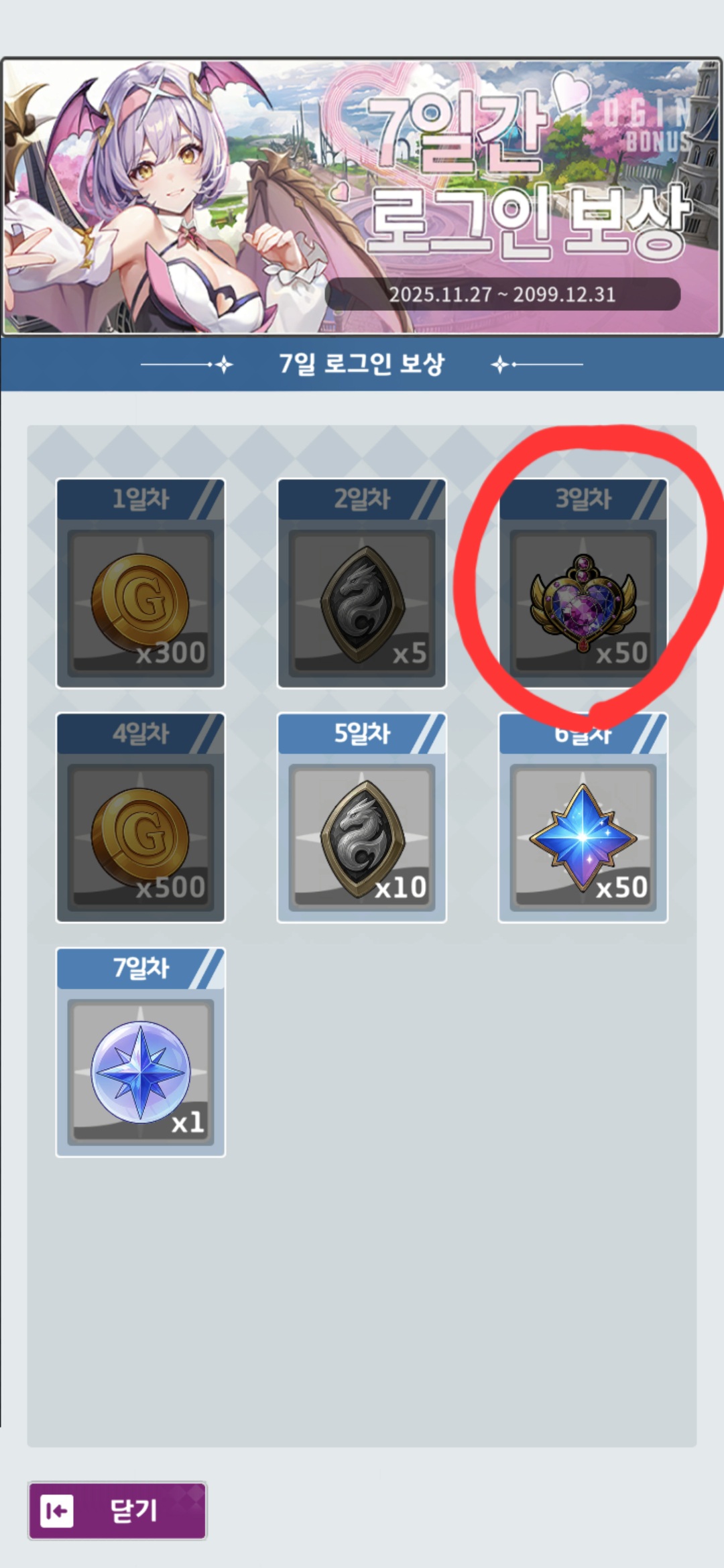 진행 중인 이벤트 게시판 - 7일간 로그인 보상(상시) 게시물에 3일차에 표기된 수량과 실지급되는 보상 수량이 일치하지 않습니다.
