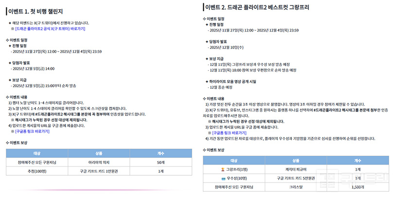 2025년 11월 27일, 플레이위드코리아의 신작 '드래곤 플라이트 2'가 그랜드 오픈했다. 과거 국민 게임으로 유행했던 '드래곤 플라이트'의 정식 후속작으로, 공개 당시부터 게이머들의 큰 관심을 받았다. 오픈에 맞춰 드래곤 플라이트 2를 즐기러 온 유저들을 위해 간단한 참여만으로 보상을 획득하는 이벤트를 시작했다. 공식 커뮤니티 이벤트 게시판에서 확인 가능하나, 일일이 게시글을 눌러 정보를 확인해야 하는 번거로움이 있다. 이에 국민트리가 드래곤 플라이트 2 오픈 기념 이벤트 일정을 정리했다.
