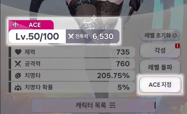 [에이스 지정] 버튼을 통해 메인 출전 캐릭터를 설정하는 방식으로 변경됩니다.