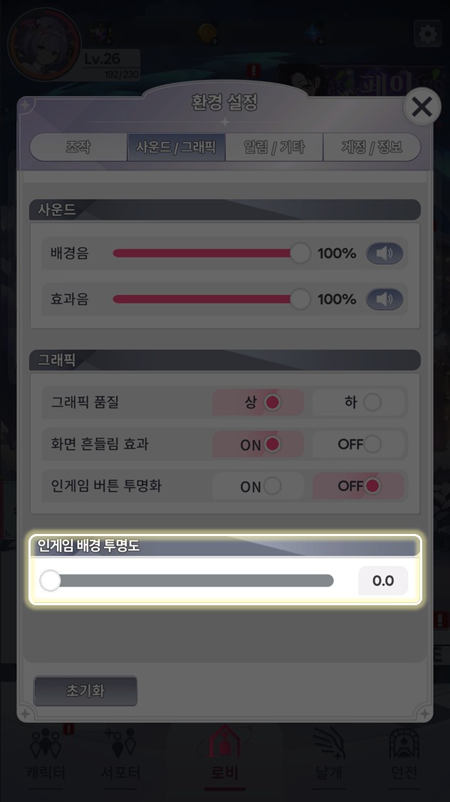 ⯌ 해당 기능은 환경 설정 → 사운드/그래픽에서 ‘인게임 배경 투명도’를 통해 조정이 가능합니다.