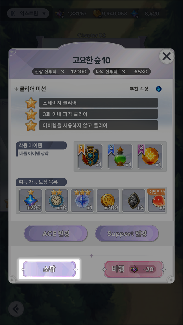 소탕 버튼 이용 시, 전투 없이 해당 스테이지 클리어 보상을 즉시 획득할 수 있습니다.
