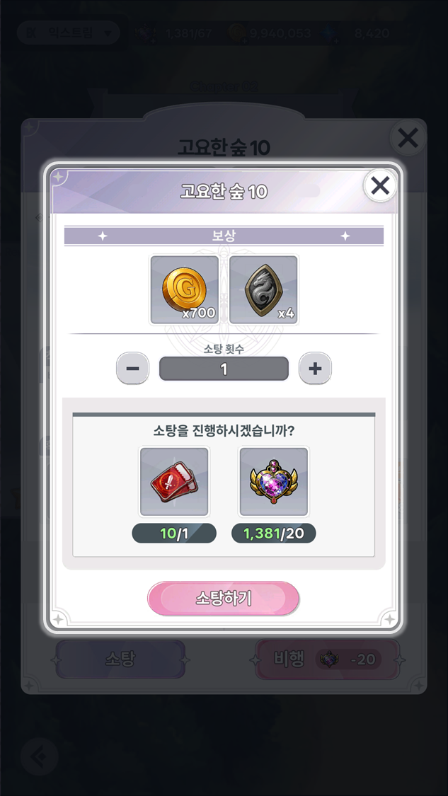▸ 예시) 익스트림 보스 스테이지인 1챕터 5 스테이지 입장 시, 20 하트를 소모하고,