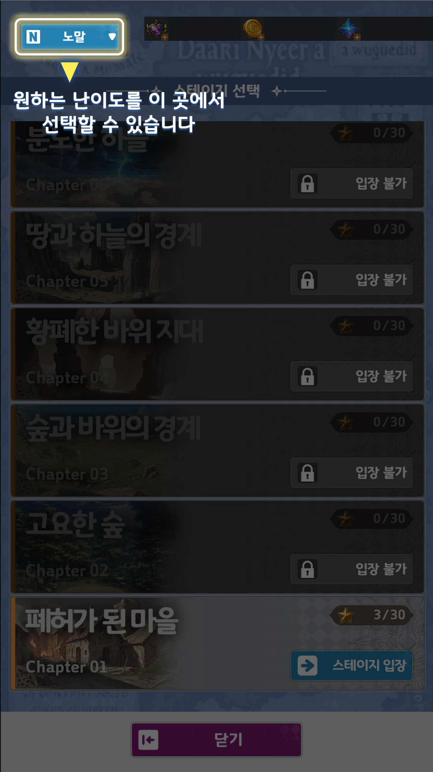 - 노말 난이도를 모두 클리어하실 경우, 하드, 익스트림 순으로 난이도를 변경하실 수 있습니다.