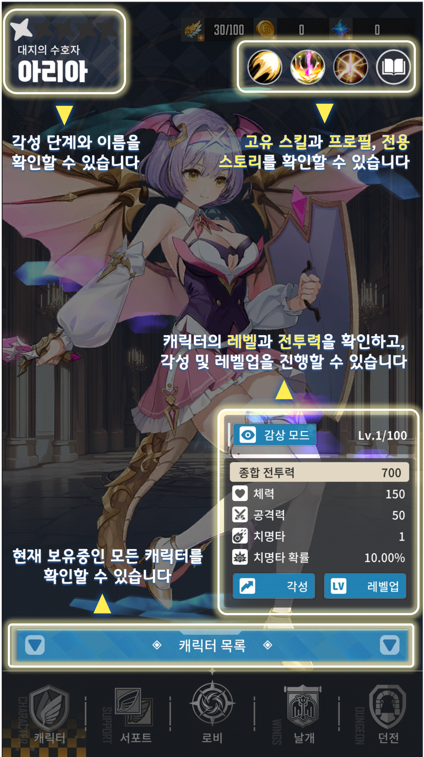- 캐릭터 각성에는 동일한 캐릭터의 의지와 속성의 정수가 필요합니다.