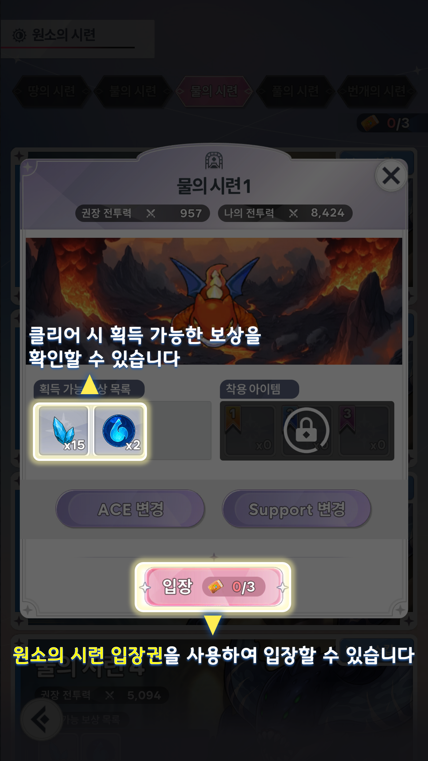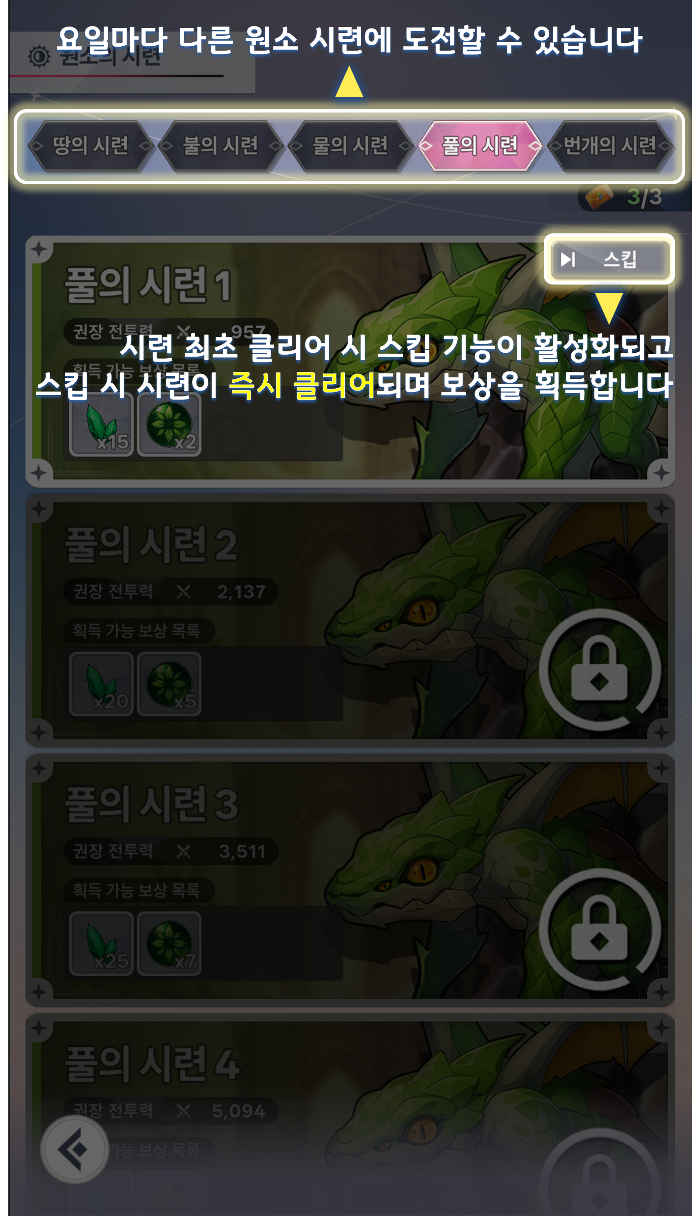 ⯌ 원소의 시련 입장권은 일일 3회 무료 갱신됩니다.