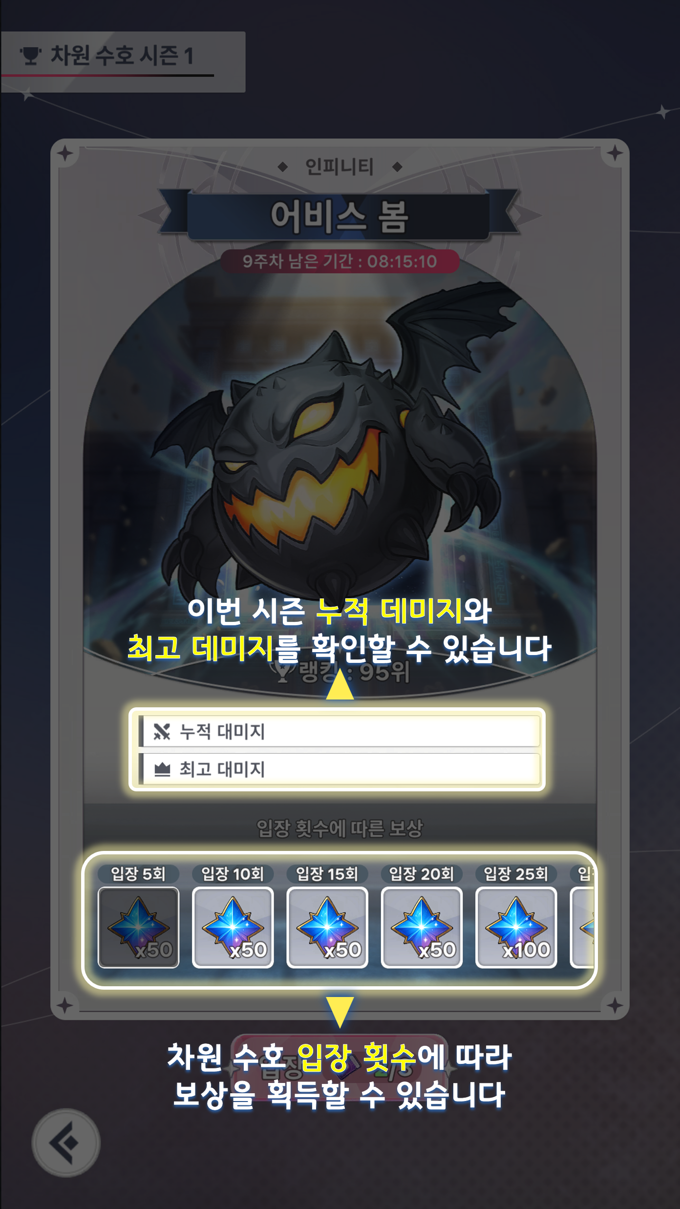 차원 수호 | 차원 수호 입장권 | 보스 몬스터에게 입힌 누적 피해량에 따라 보상을 차등 지급합니다. | 보스 몬스터에게 입힌 누적 피해량에 따라 돌파석 획득 |