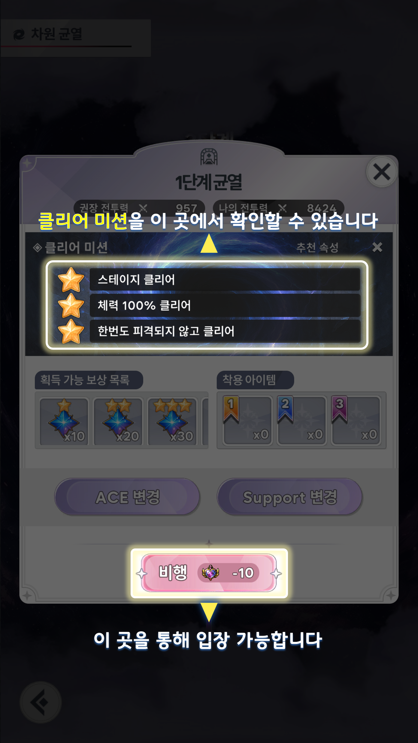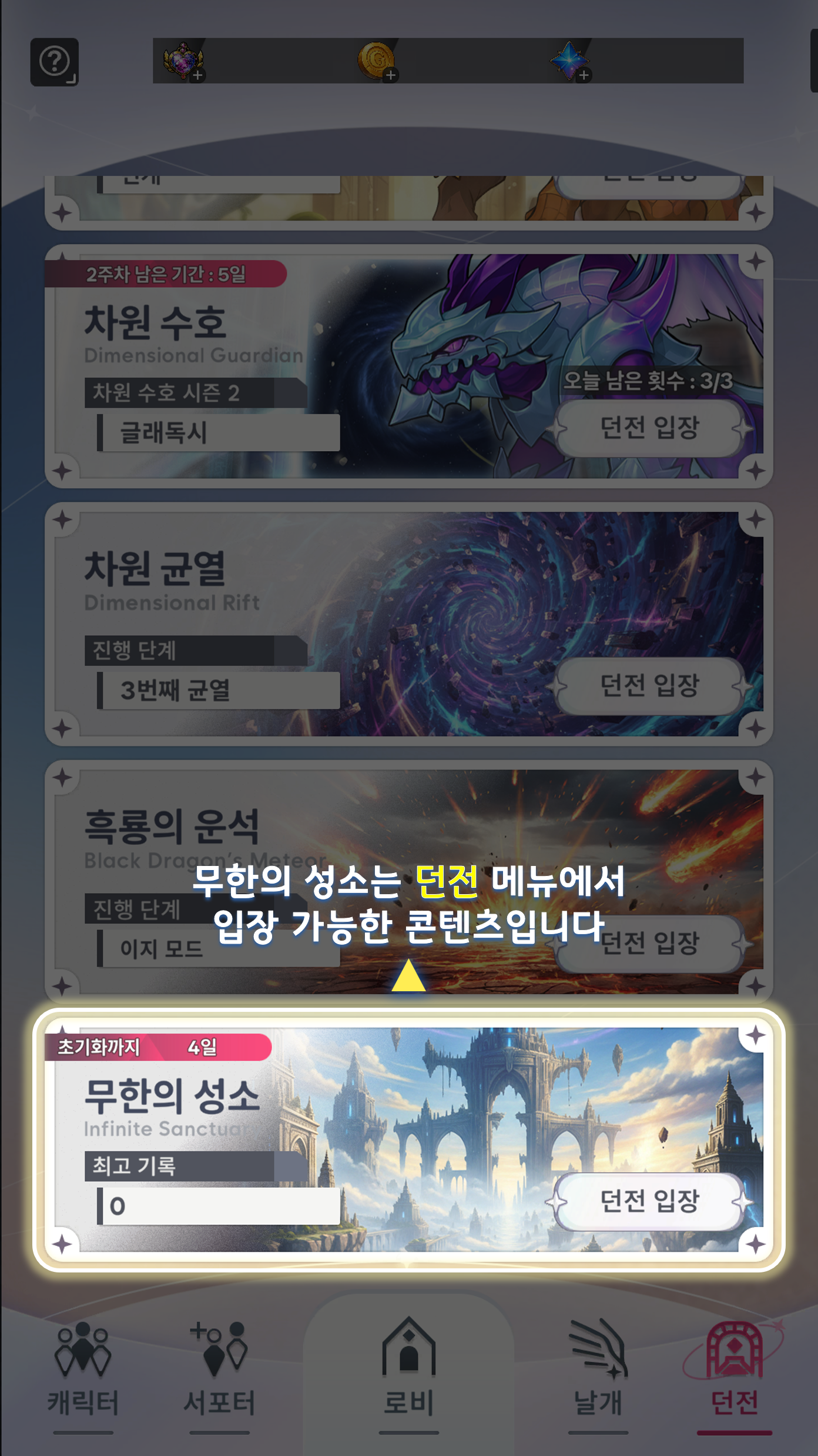 차원 균열 | 하트 10개 | 던전 클리어 시 계속해서 더 높은 난이도에 도전할 수 있습니다. | 미션 진행도에 따라 골드 / 크리스탈 획득 |
