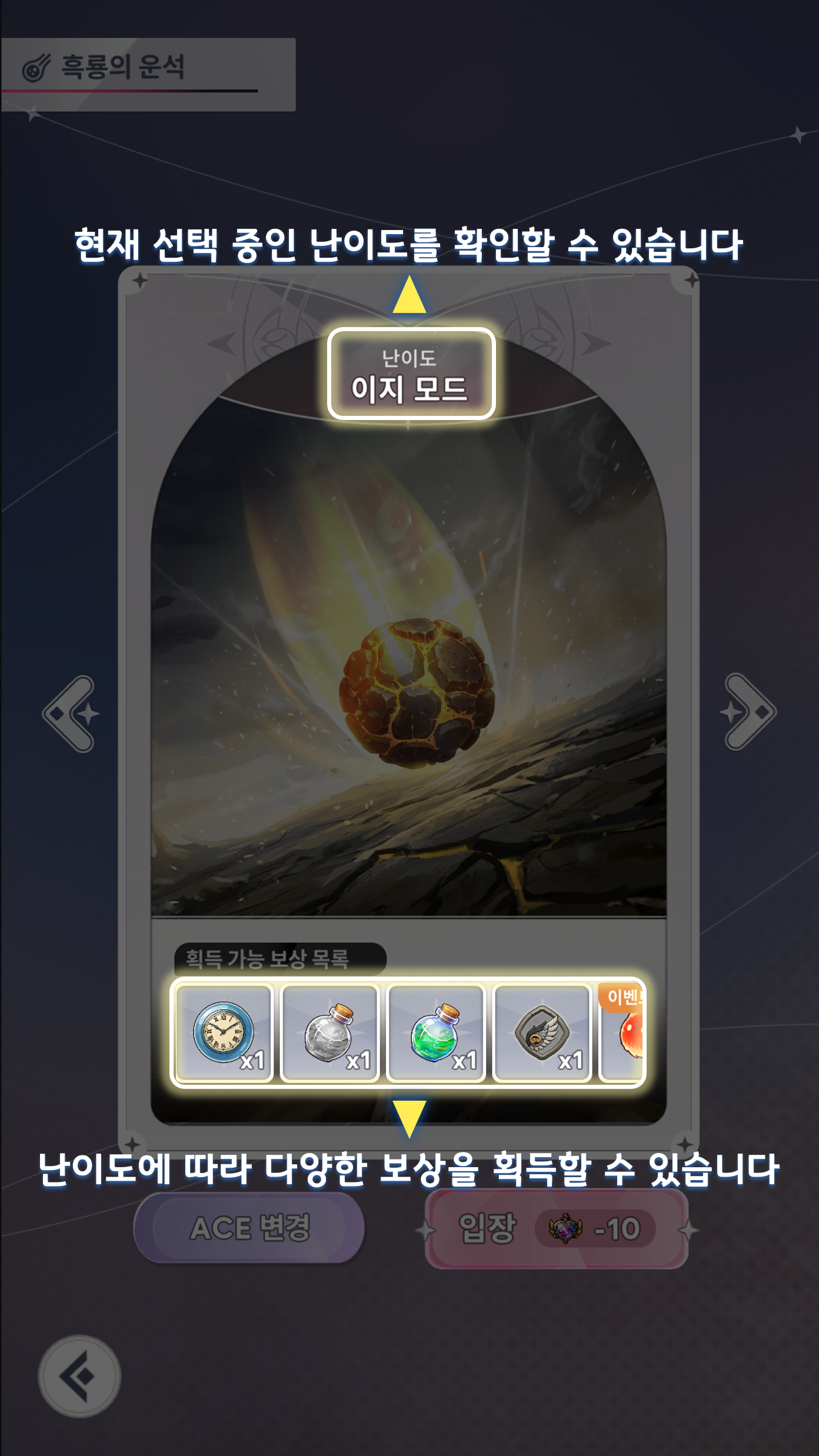 흑룡의 운석 | 하트 10개 | 제한 시간동안 날아오는 운석을 피합니다. | 난이도에 따라 운명석 / 노멀 ~ 에픽 날개 획득 |