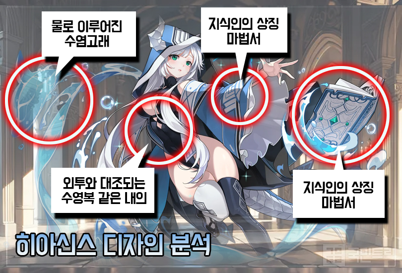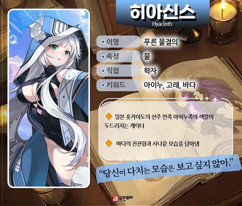 종합하면, 히아신스는 아이누와 물을 중심으로 캐릭터를 설계한 것으로 풀이된다. 그중 '물' 키워드는 캐릭터 성격에도 반영했다. '조용하고 잔잔한 물결과 같은 학자'라는 소개 문구가 그러하다. 더불어 히아신스의 이야기 2편에서는 '잔잔한 물결은 악을 씻어내고, 거친 파도는 악을 휩쓸었다'라는 문구가 눈길을 끈다. 바다의 다양한 면모를 한 캐릭터에 담은 듯하다.
