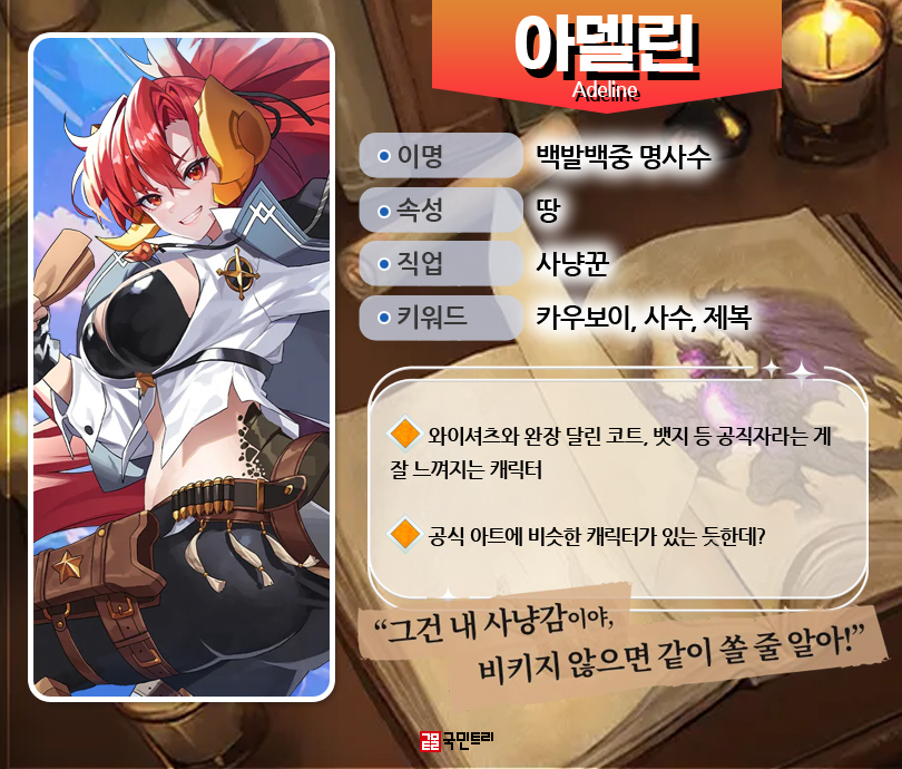 더불어 한 손에는 누런 종이를 꽉 쥐고 있다. 서부극의 현상수배지나 의뢰가 적힌 양피지가 떠오른다. 마침 그녀는 사냥꾼이라고 하는데, 사냥 대상이 현상금이 걸린 수배자나 몬스터가 아닐까 싶다. 괜찮아, 나만 아니면 돼!