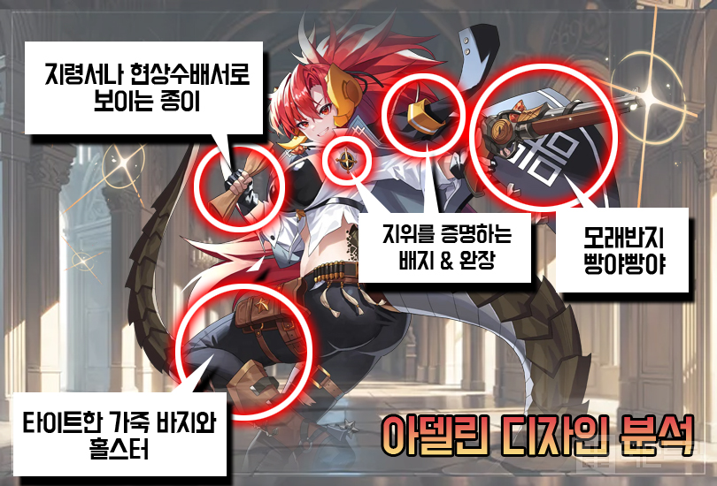디자인의 포인트는 상의의 아이템이다. 아델린은 앞섶을 풀어헤친 와이셔츠를 입었고, 어깨에 코트를 걸쳤다. 여기서 와이셔츠의 뱃지와 코트 팔목의 완장이 중요하다. 이건 현실에서 사회적 지위를 상징하는 아이템이다. 뱃지는 서부극의 카우보이나 미국 형사물에서 경찰들이 지닌 것으로 묘사한다. 가령 경찰이 퇴직할 때 경찰 배지를 반납하는 게 좋은 예시다. 코트를 어깨에 걸치는 것도 흥미롭다. 옷을 변칙적인 방법으로 입는 점에서 그녀의 성격이 쉽게 예상된다.