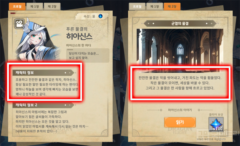 첫 번째로 분석할 드래곤 플라이트2 캐릭터는 히아신스다. 그녀는 학자로, 연금술사인 페이와 함께 지식인 속성을 담당한다. 그중 히아신스는 판타지 또는 원주민 부족 학자의 분위기가 느껴진다. 그녀는 바다빛 로브를 걸친 학자로, 일러스트에는 마법서를 펼친 채 물의 마법을 사용하는 모습을 담았다. 인게임 투사체도 물 덩어리며, 스킬 사용 시 폭발하는 물방울을 발사한다.