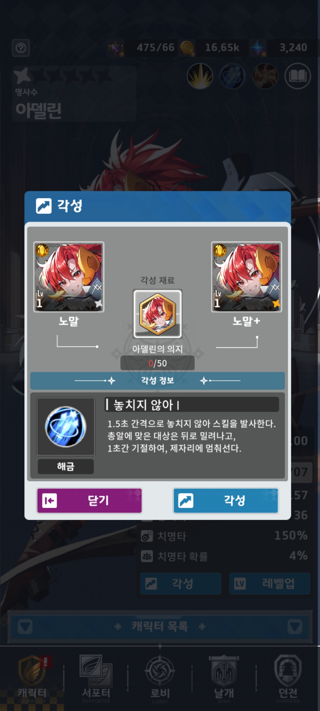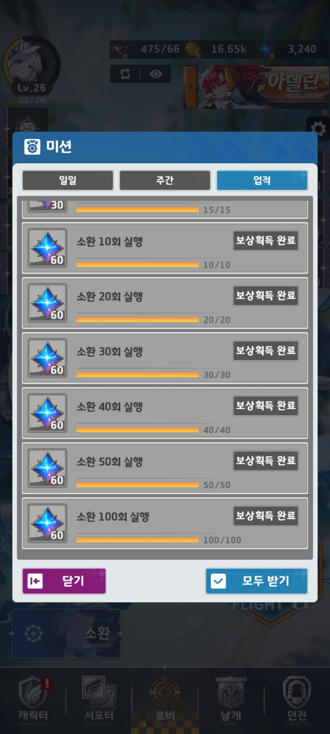 100번 뽑기 했다는 미션을 클리어 한 사진 (100번 중 20번은 날개였을거고, 80번정도가 캐릭터 소환이었습니다. 상식적으로 그 중에 1번은 아델린을 뽑았다는걸 설명드리려고 캡쳐했습니다.)과, 아델린의 의지 0개인 현상태를 보여드립니다.
