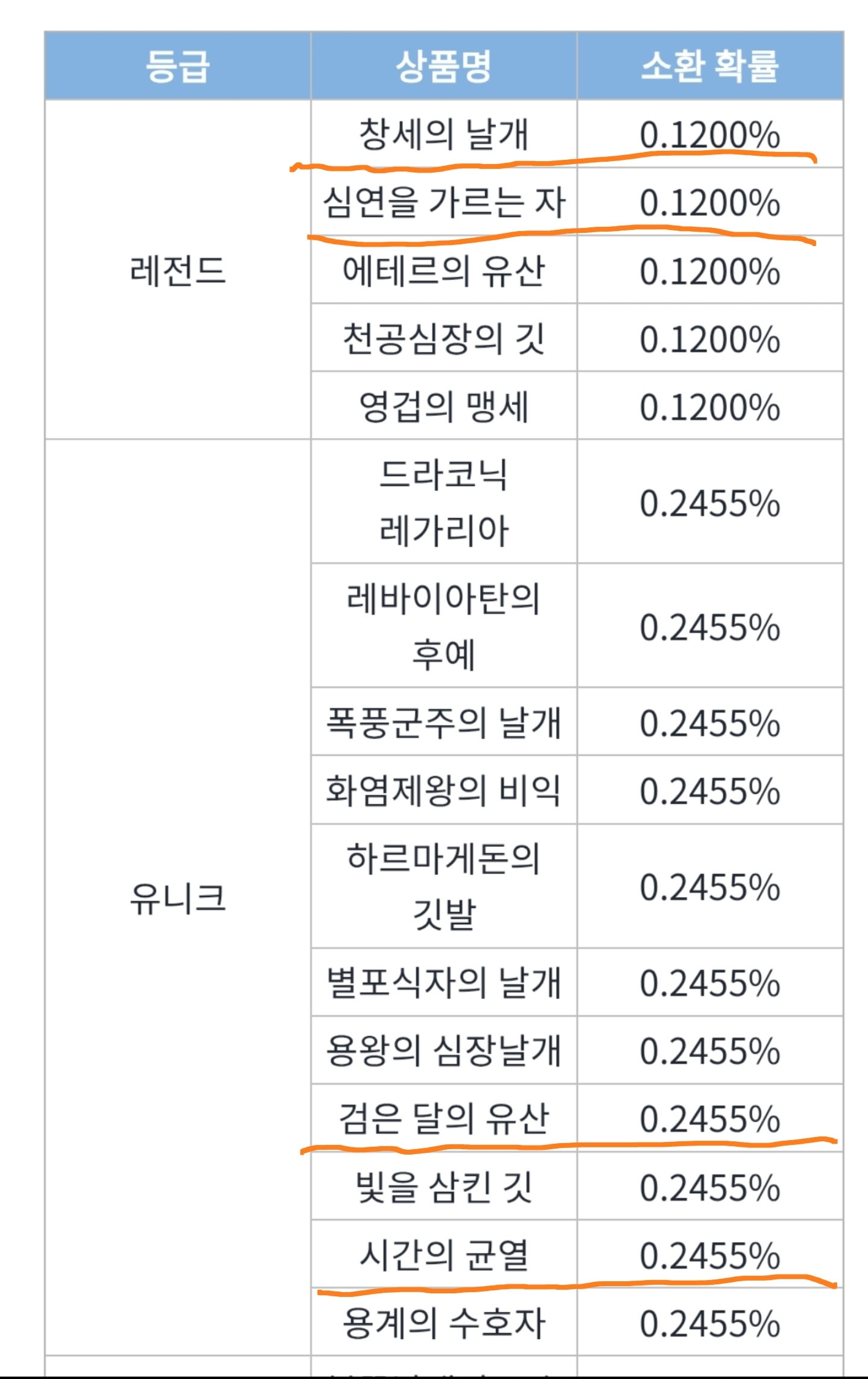 레전드날개 뽑기가 0.12%로 현질 많이해도 겨우 하나 뽑을까말까한 정도인데 레전드 없으면 게임하기 힘들다는 불만이 많아서인지 이번에 밸런스조정 차원인지 수치를 레전드는 내리고 유니크는 반대로 올렸네요 레전드 못얻은 사람들에 대한 배려같은 생각이 드네요