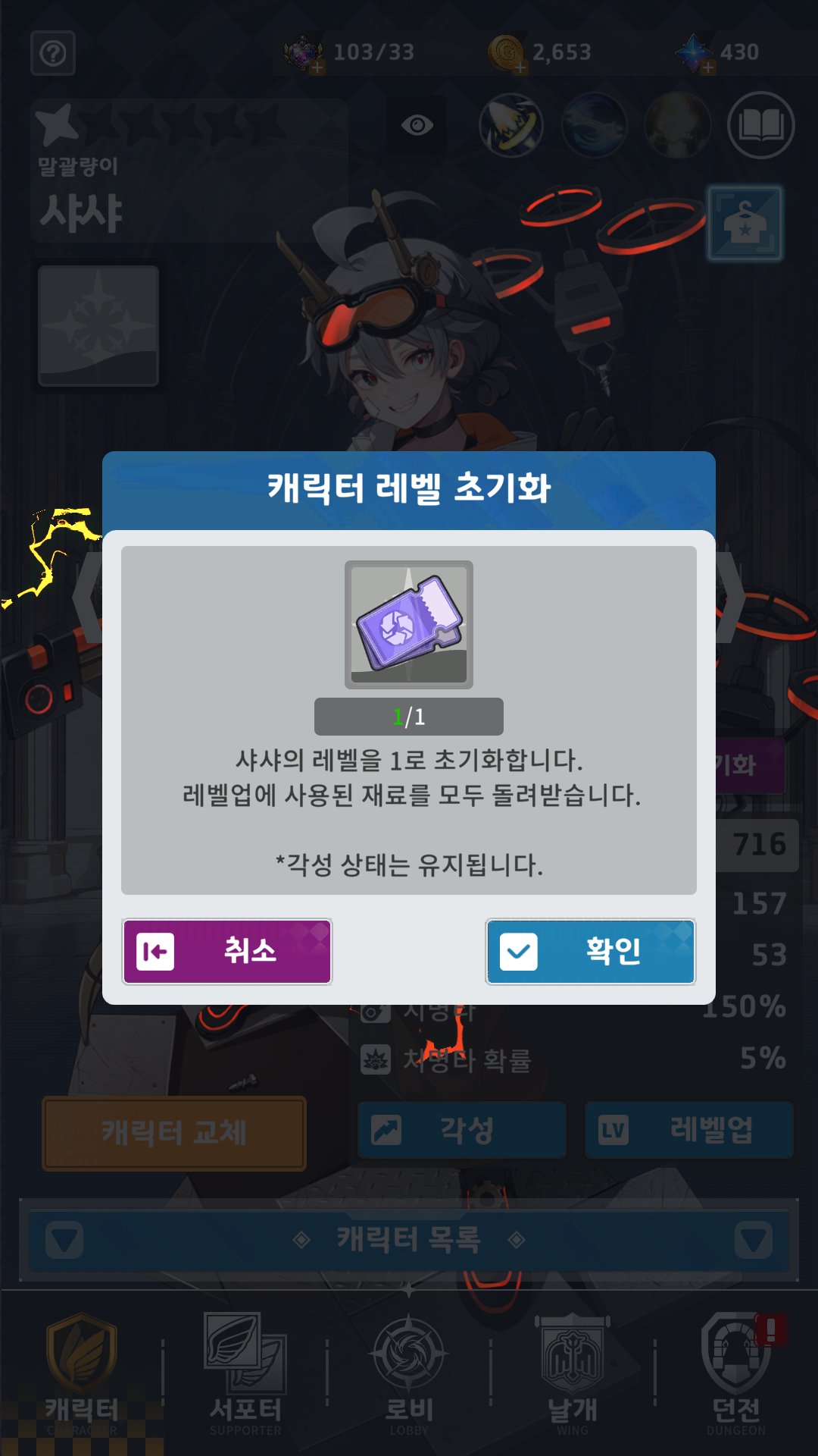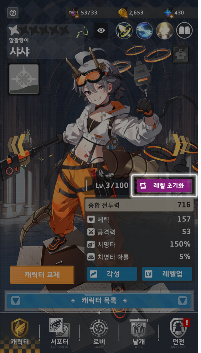 ⯎ 캐릭터 레벨 초기화 기능 추가