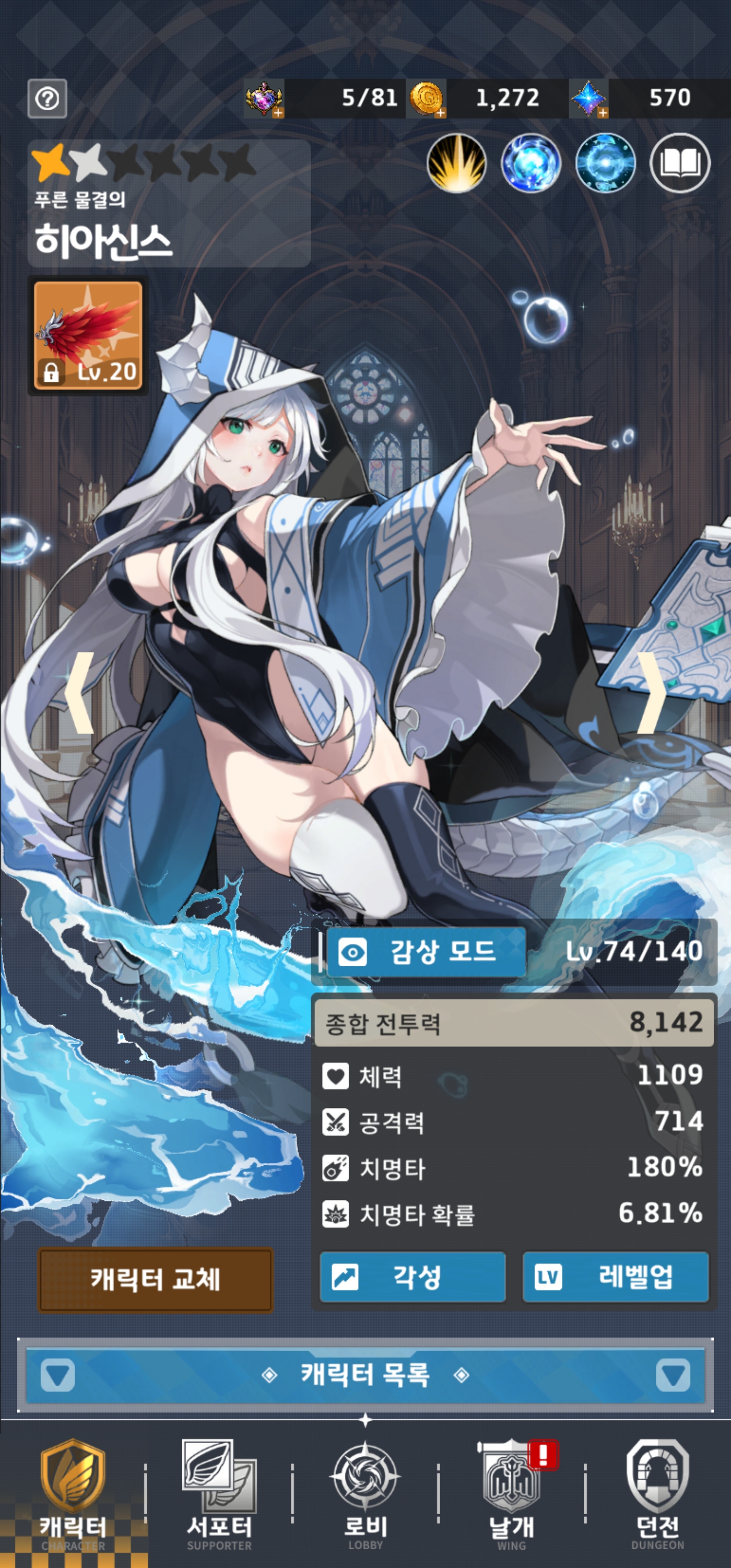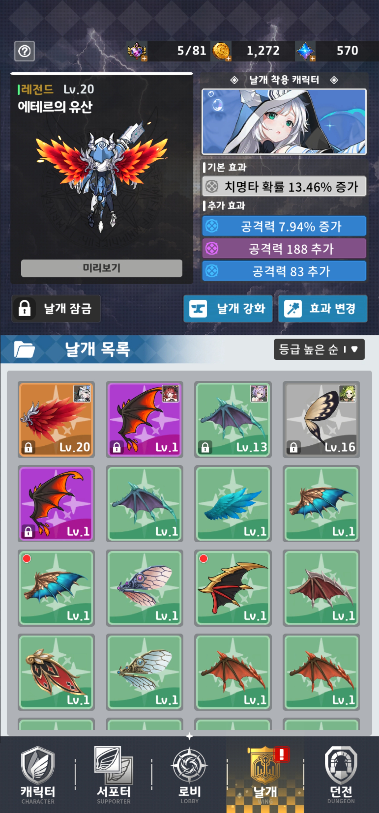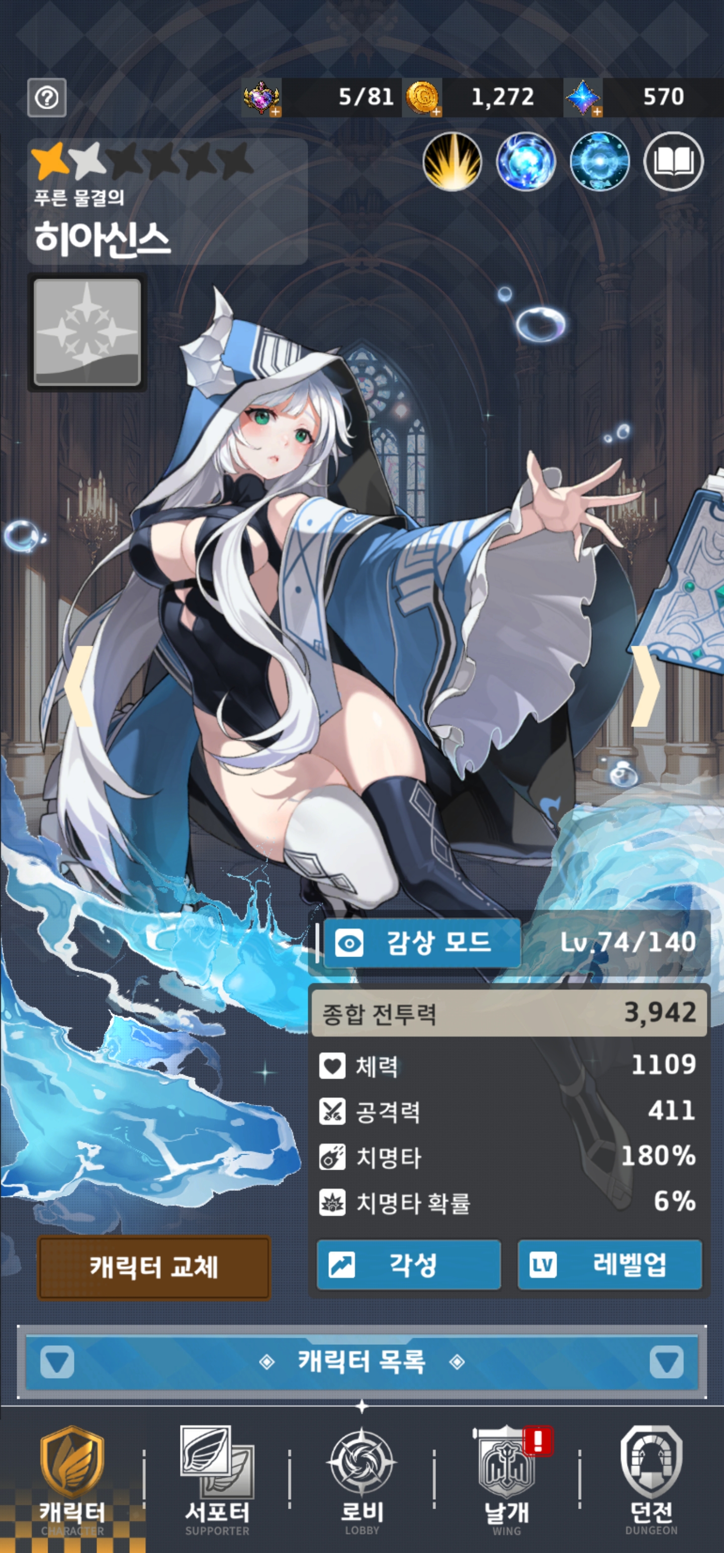 날개 없는 레어 히아신스 74레벨의 기본 공격력은 411입니다.