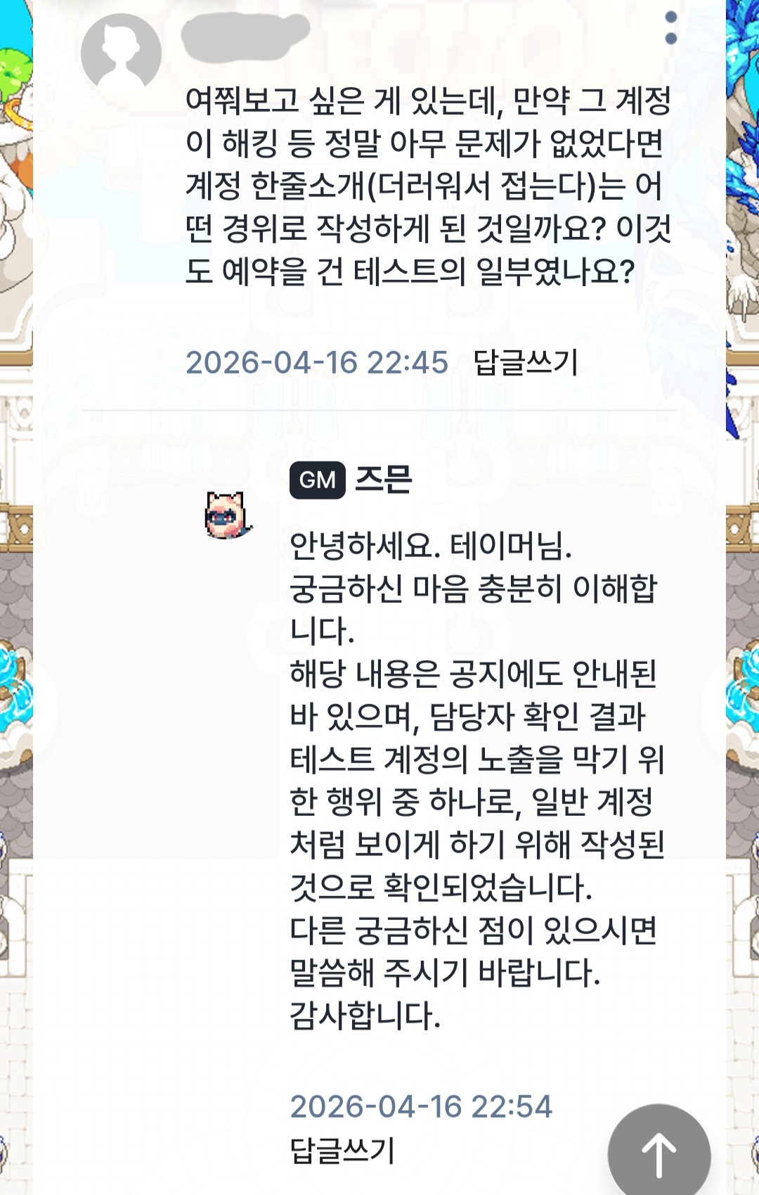 꼬리 자르기: 걸리니까 테스트 계정이라고 둘러대는 전형적인 '사과문'으로 유저들을 바보 취급하고 있습니다.