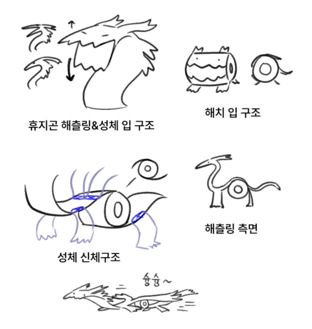 극초기 디자인,,,, 해치는 한번에 뽝!!! 그렸는데 성체에서 애를 좀 먹었습니다