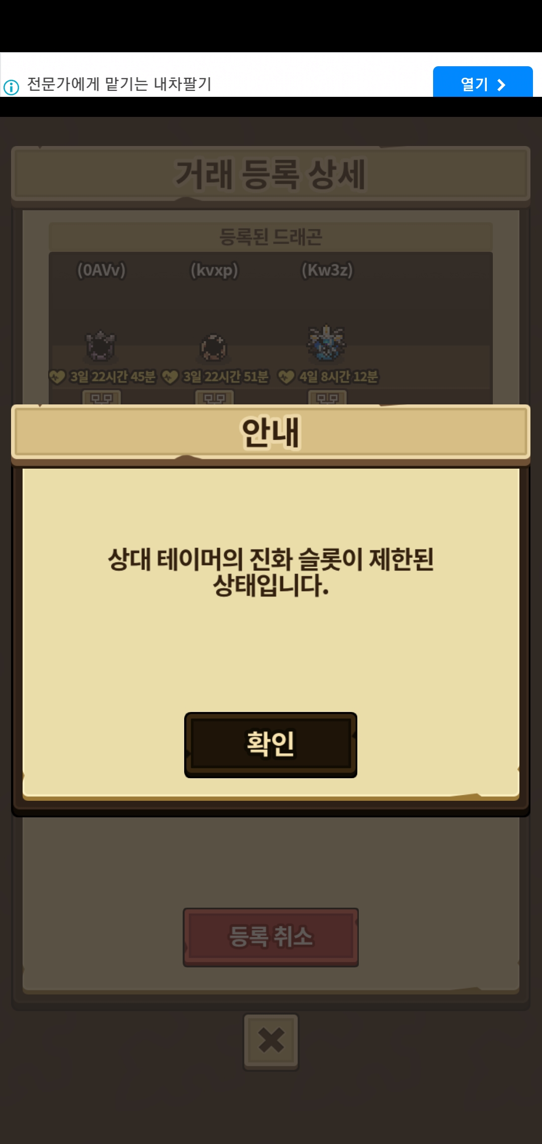 제가 거래게시판 올리고 스텔스가 들어왔거든요 전 이거 한마리도 너무 기뻤어요 근데 거래수락하려니까 이 문구가 뜨더라구요 전에도 스킨크,팽이버섯,애플칙으로 거래게시판 올렸는데 고대신룡 뜨길래 수락을 눌렀는데 그전에도 이 문구가 떴어요 왜 제가 수락만 누르면 이 문구가 뜨는 이유를 알고싶네요 게스트 계정이라 그런가요?