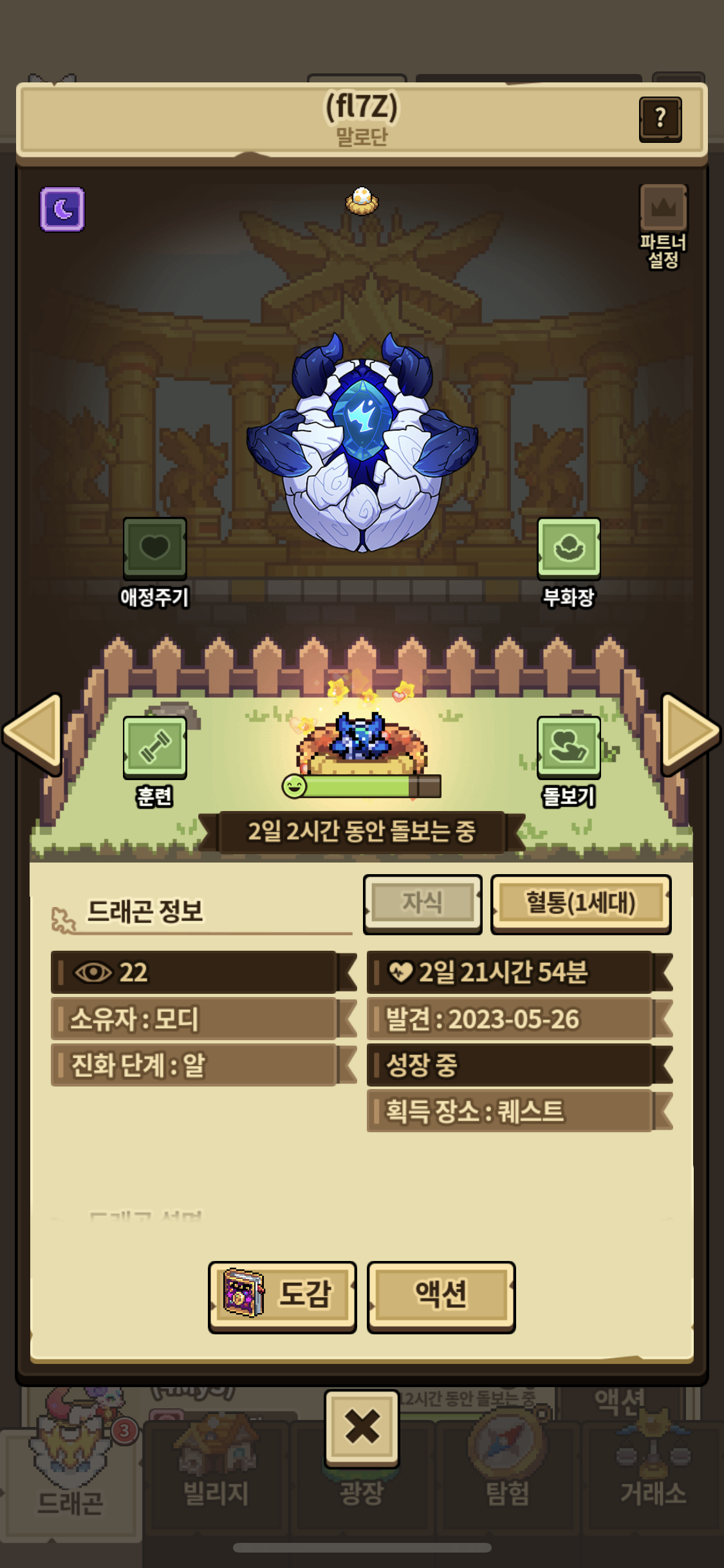 얻은 순간부터 쭉 질병작 하다보니 시간이 애매하게 남아서 2일 1시간 째일때부터 그냥 질병 안걸리게 둔건데요.. 에그드래곤도 쿨이라서 겁나네여,,,20시간안에 애정주기 뜰려나여