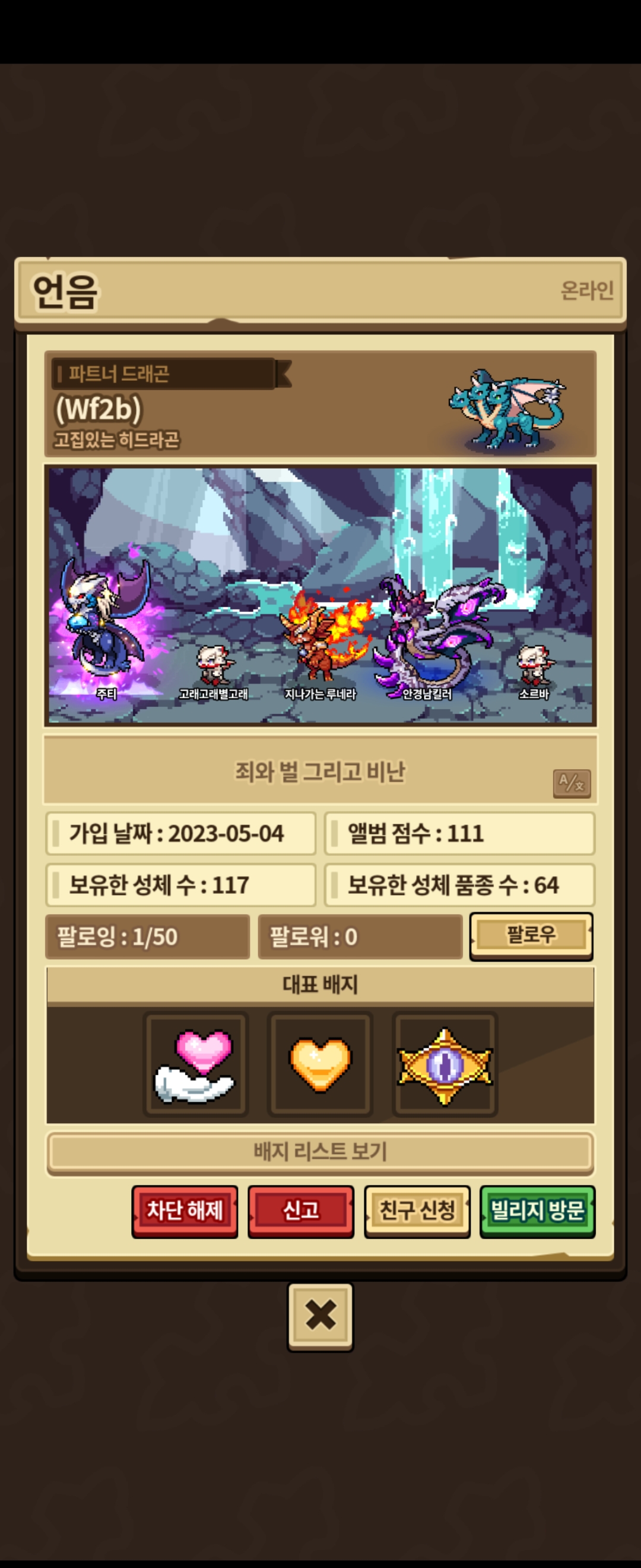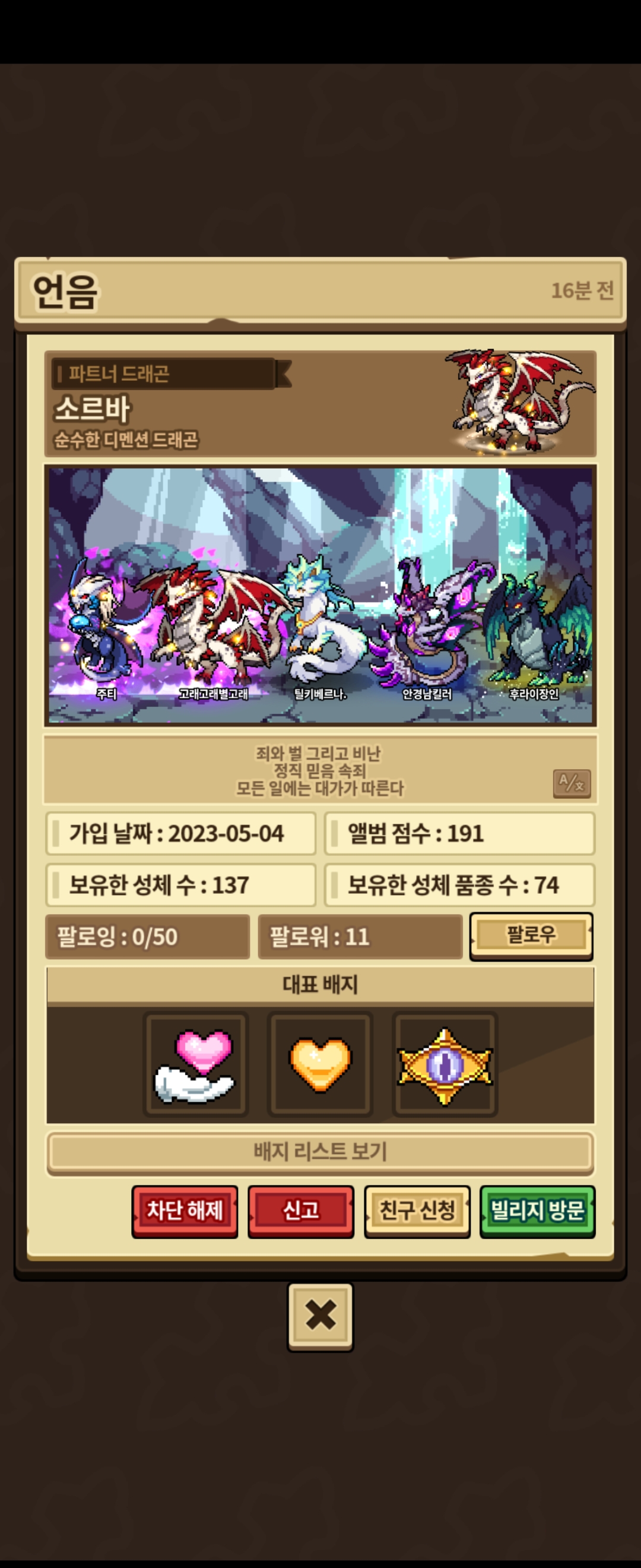 + 제 디멘션 몰입작 중이였는데 달빛 써서 순수로 바꿔놓고 차단 풀고 방명록 남기니까 제 드래곤 파트너로 설정해둔 꼬라지가 정말 ^^ 프로필 메세지도 바꿨던데 웃기네요 ㅋㅋ
