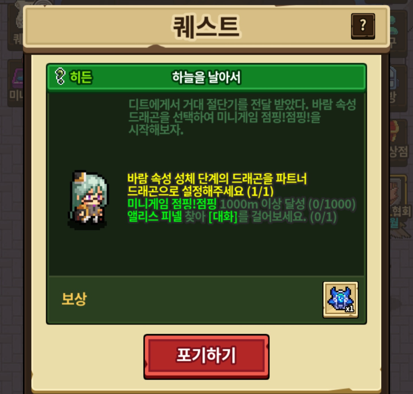 1000m 넘겼고 한 번 클리어 보상 받으려고 했다가 알자리 없어서 튕겼는데, 이젠 퀘스트 완료도 안 뜹니다.