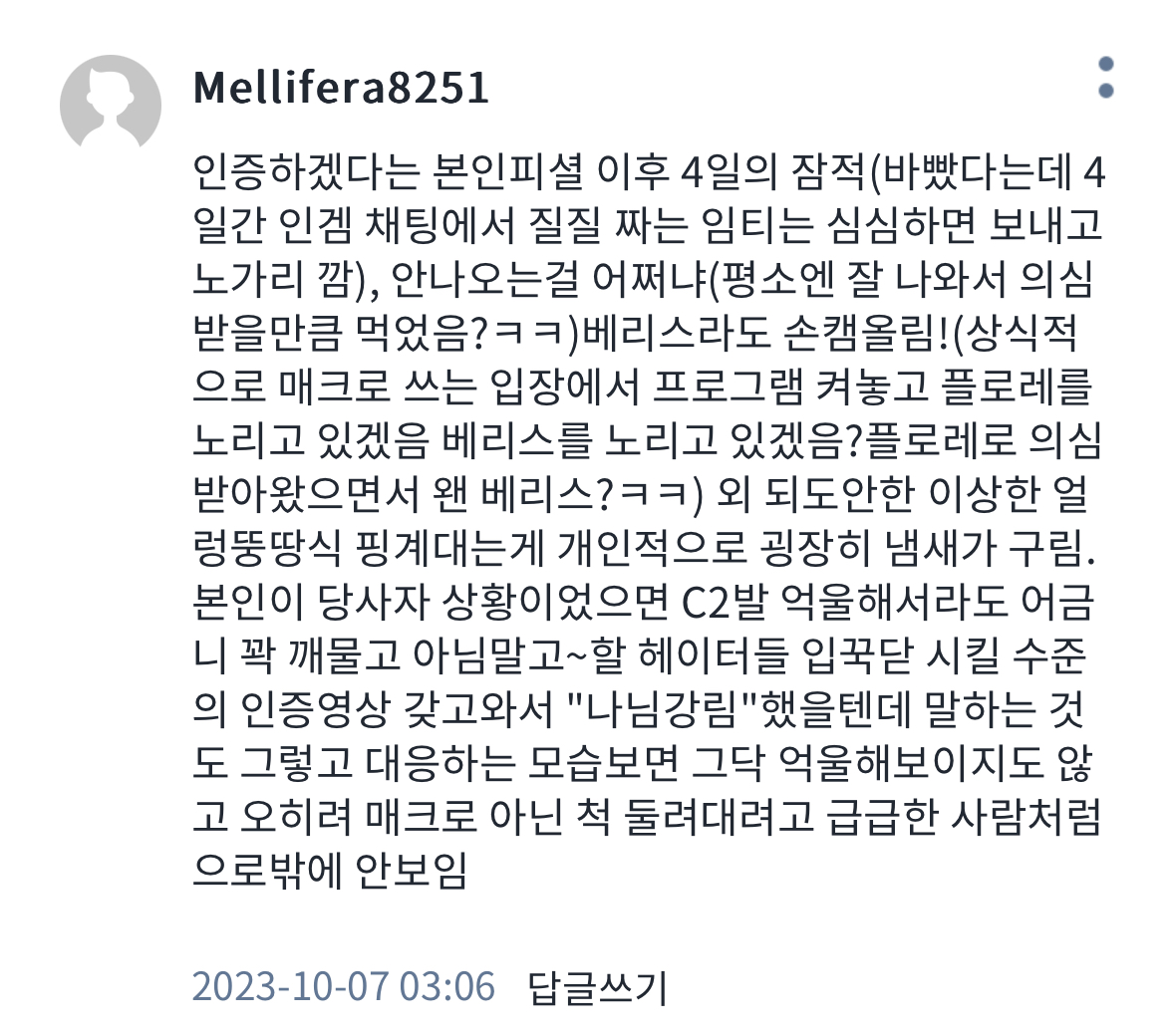 위 사진의 댓글을 다신 분과 같이 저것이 저의 입장표명이고 억지부린다고 생각하셔도 됩니다. 하지만 앞서 말 했듯 손이 느린 저도 4일이면 베리스 및 플로레 1-2마린 잡습니다.. 제가 처음부터 원했던 손캠은 플로레를 2마리 이상 잡는 것을 원했습니다..