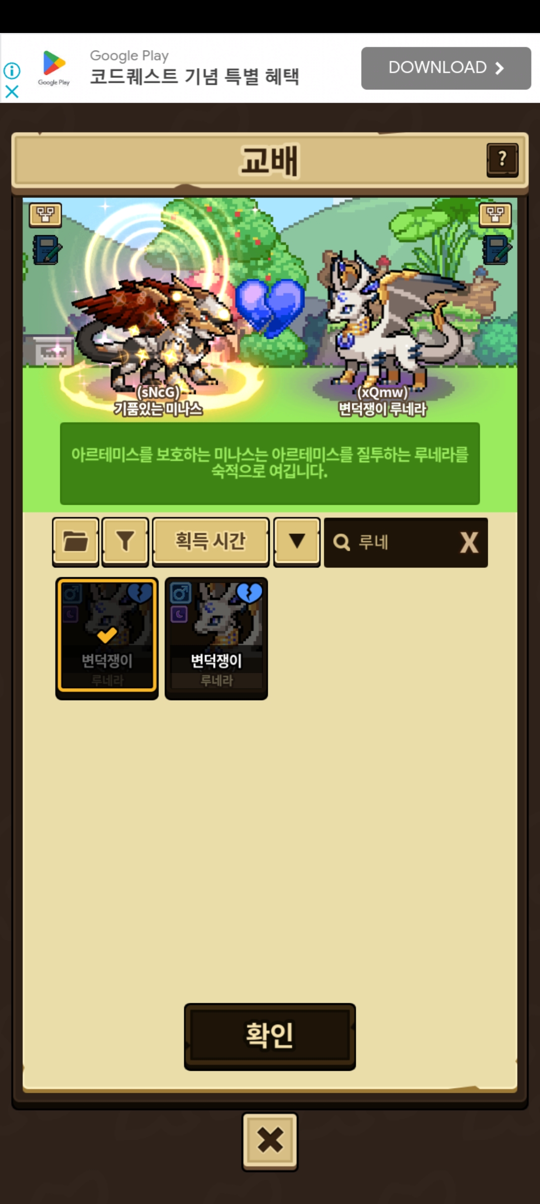 반대로 미나스랑 아르테미스는 교배가능합니다