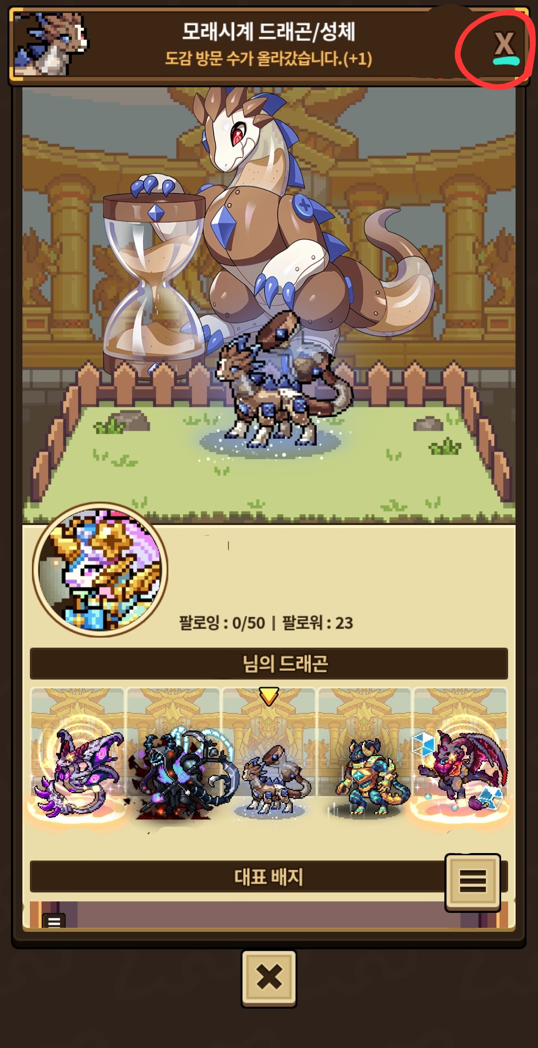 아직 도감이 채워지지 않은 드래곤을 쓰담하는 경우, 상단에 도감 방문 수가 올라갔다는 팝업이 뜨게 되는데 그 팝업이 쓰담하려면 눌러야 하는 상세정보 버튼을 가리면서 다음 드래곤을 쓰담하려면 계속 X 버튼을 눌러줘야 한다는 게 너무 불편하네요