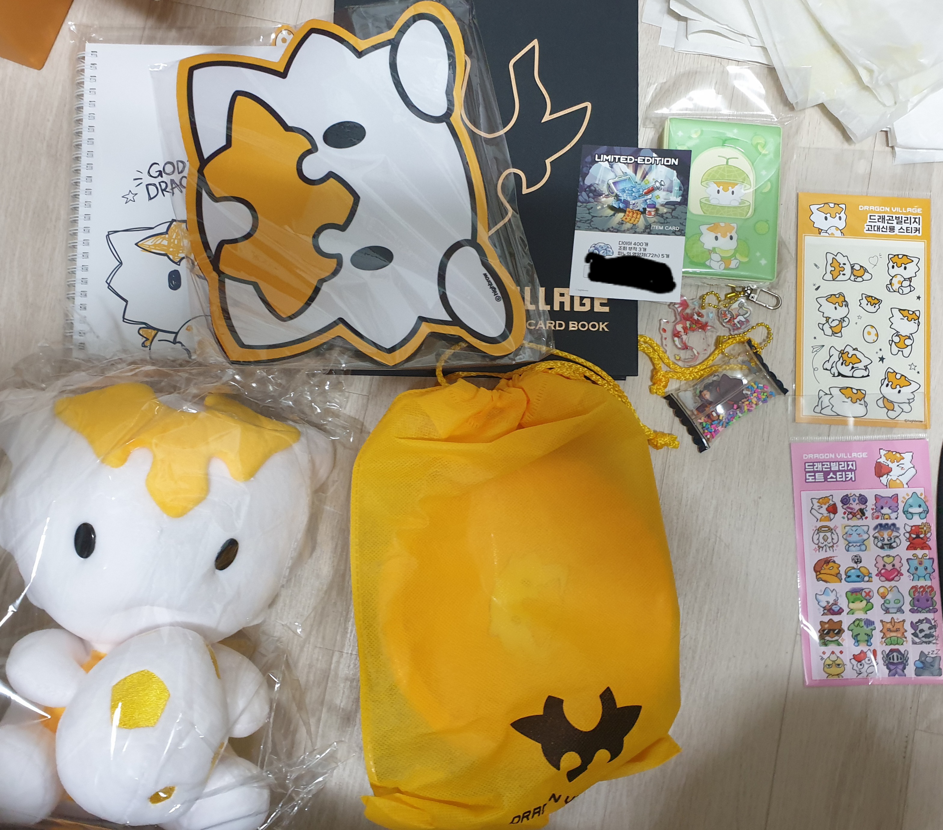인형,패우스패드, 노트, 카드 컬렉션북, 미니노트 키링 2개, 스티커 3개, 노란 주머니, 인게임 다이아및 아이템쿠폰