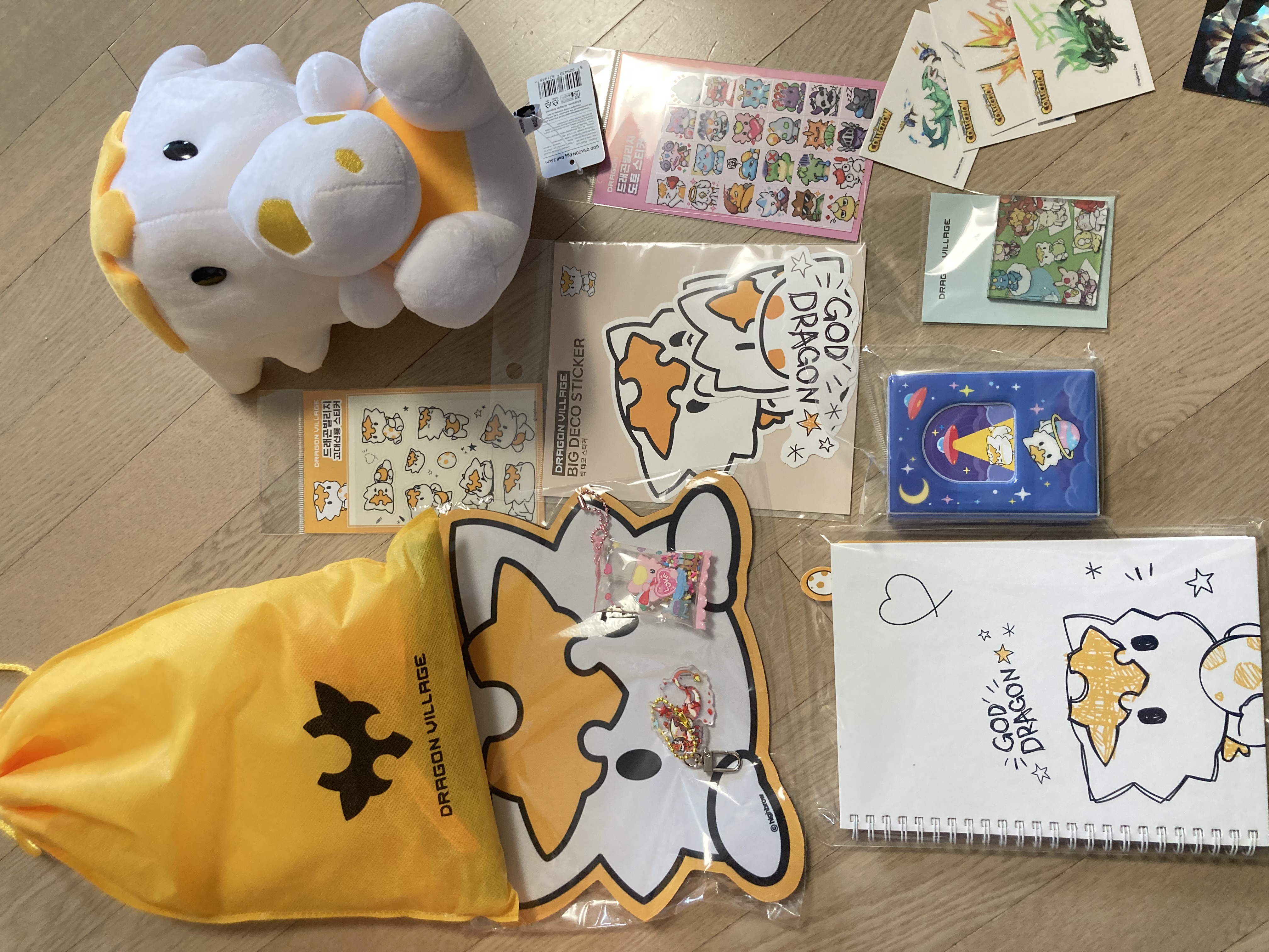 랜덤박스는 이렇게 나왔어요! 노란 가방 안에는 고신 그려져있는 일회용품들 있어요.(냅킨도 있다는..!!)