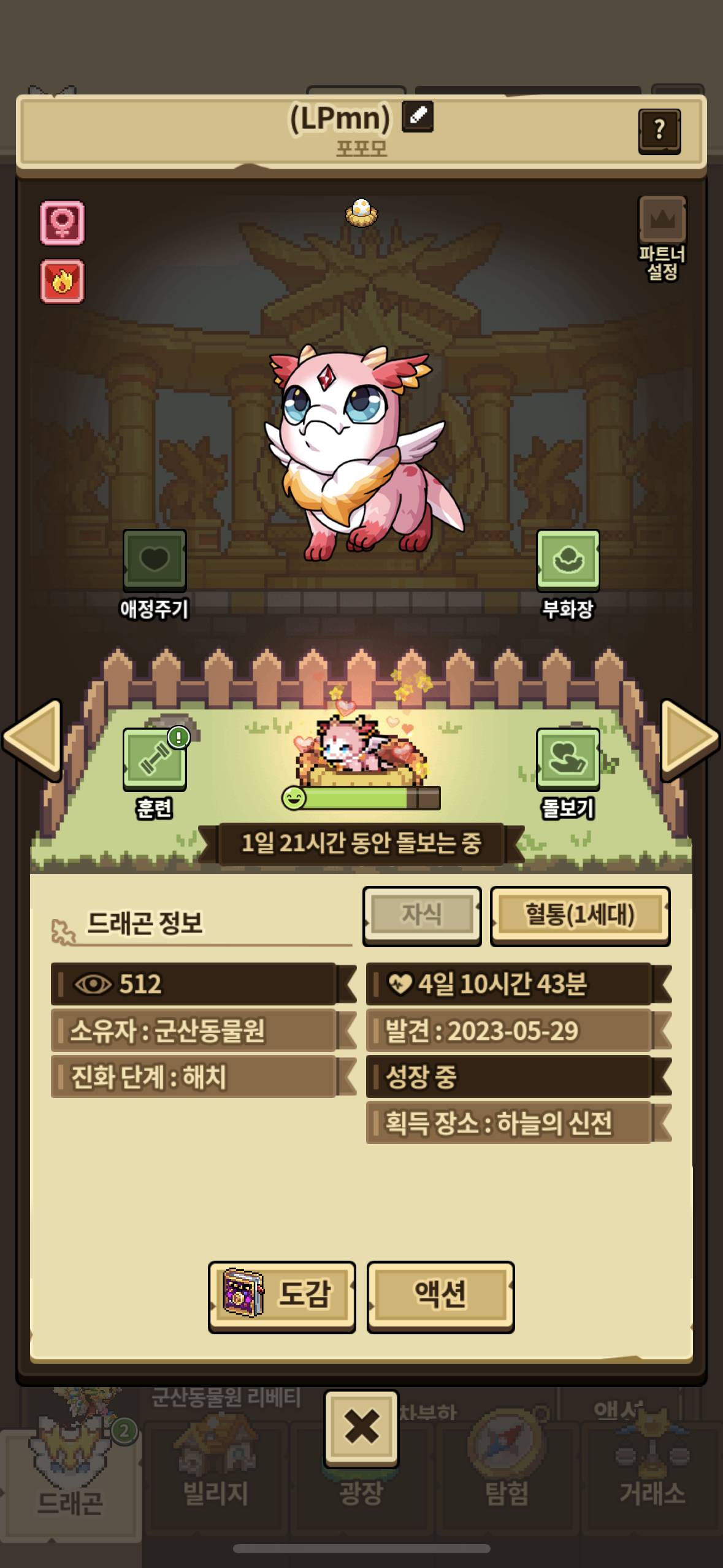 처음에 외로워하는 만들려고 훈련 아무것도 안했다가 리베티 성체되서 사랑스러운 작을 하고싶어서 조회수 500회를 채웠는데 천진난만한 이에요.. 곧 해츨링 될 거 같은데 뭐가 문제일까요??ㅠㅠ