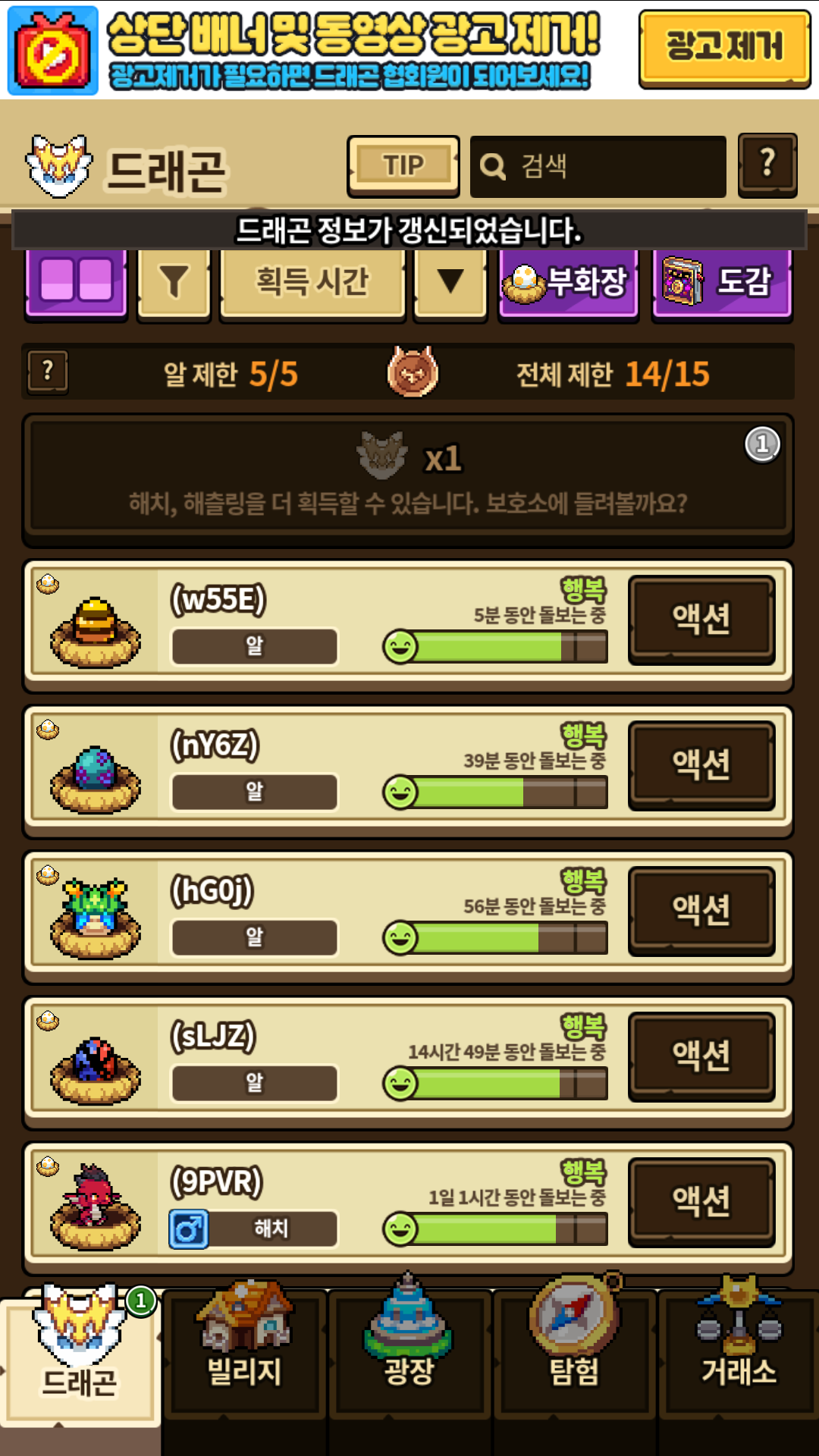 60종 모으기 퀘스트라서 정말 아무 드래곤이나 가져가려고 했는데, 이미 키운 것만 계속 보이더라고요~