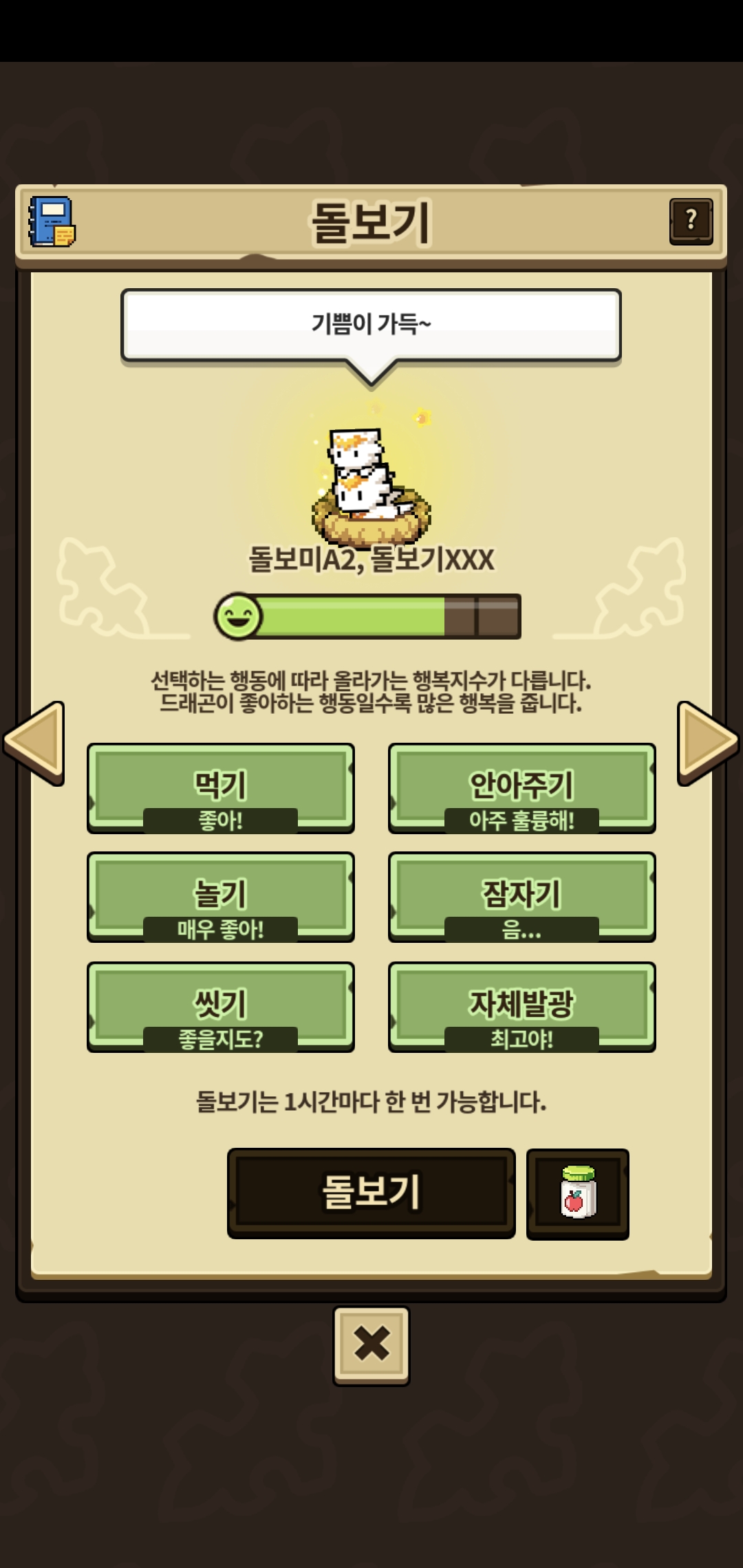 멍청하게ㅠ “이제 훈련 한 번 남았으니까 슬슬 진화 시간 맞추게 만족도 올려놔야지~”하면서 돌보기…를… 했음…
