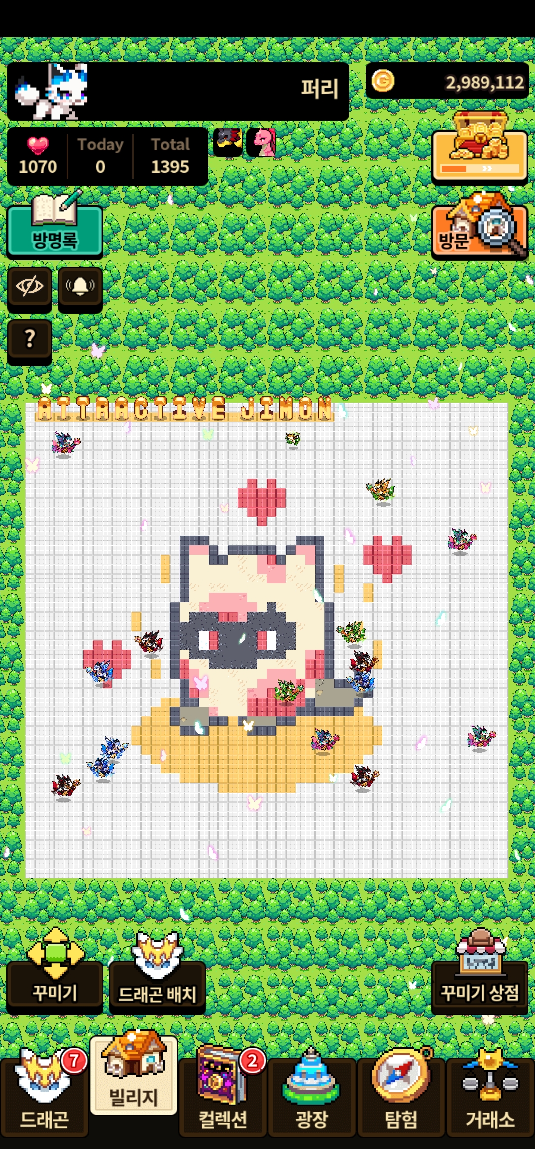 제 빌리지에 클로버 수컷 한마리 제외하고 두쌍씩 전부 해츨링으로 유지중이에요 클로버는 성격작 때문에 바로 진화시키긴 어려울 거 같고 나머지 친구들은 오늘까진 해츨링 유지시킬 예정이니 필요하신 분들은 한번씩 와서 하고 가세요