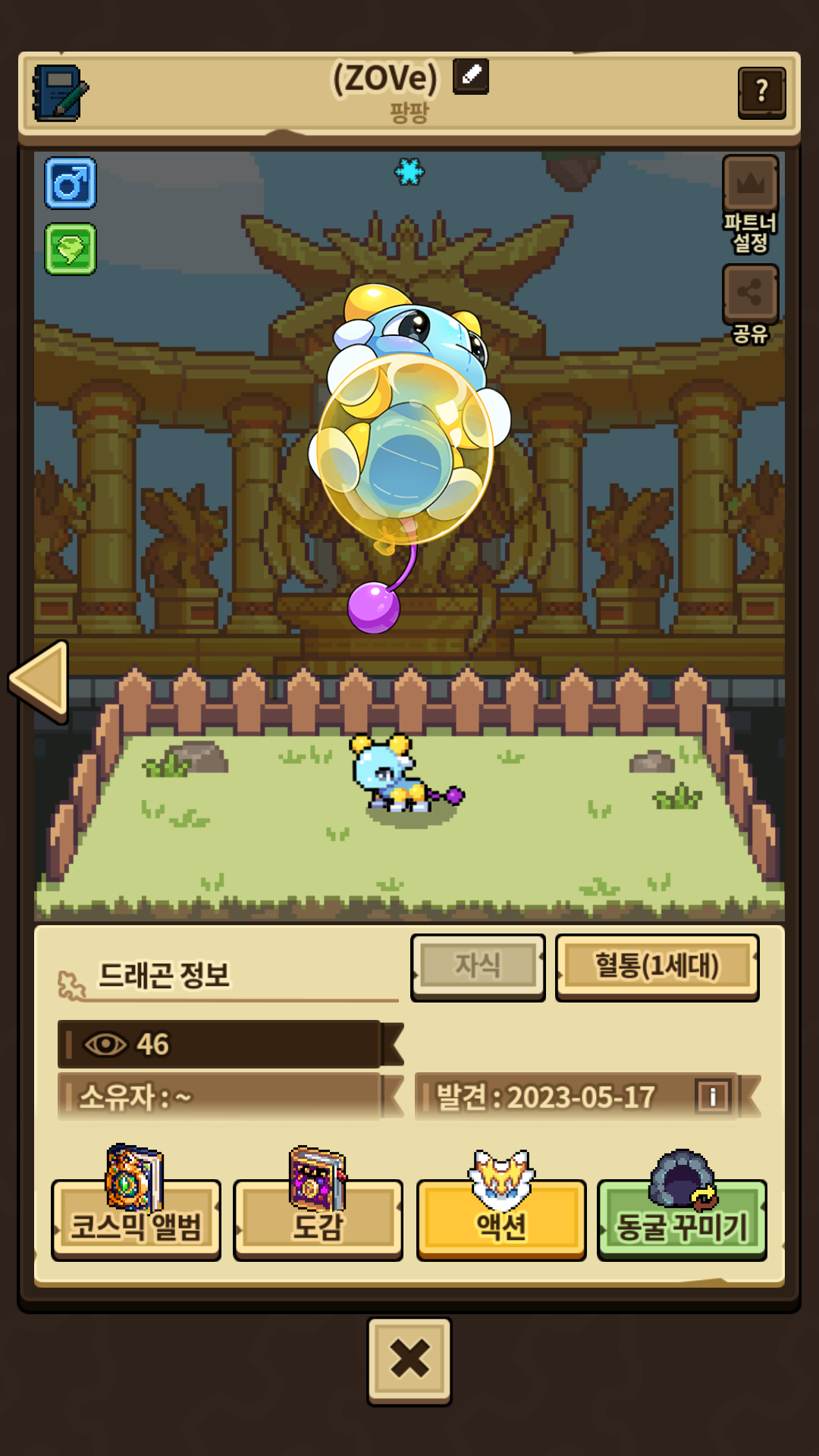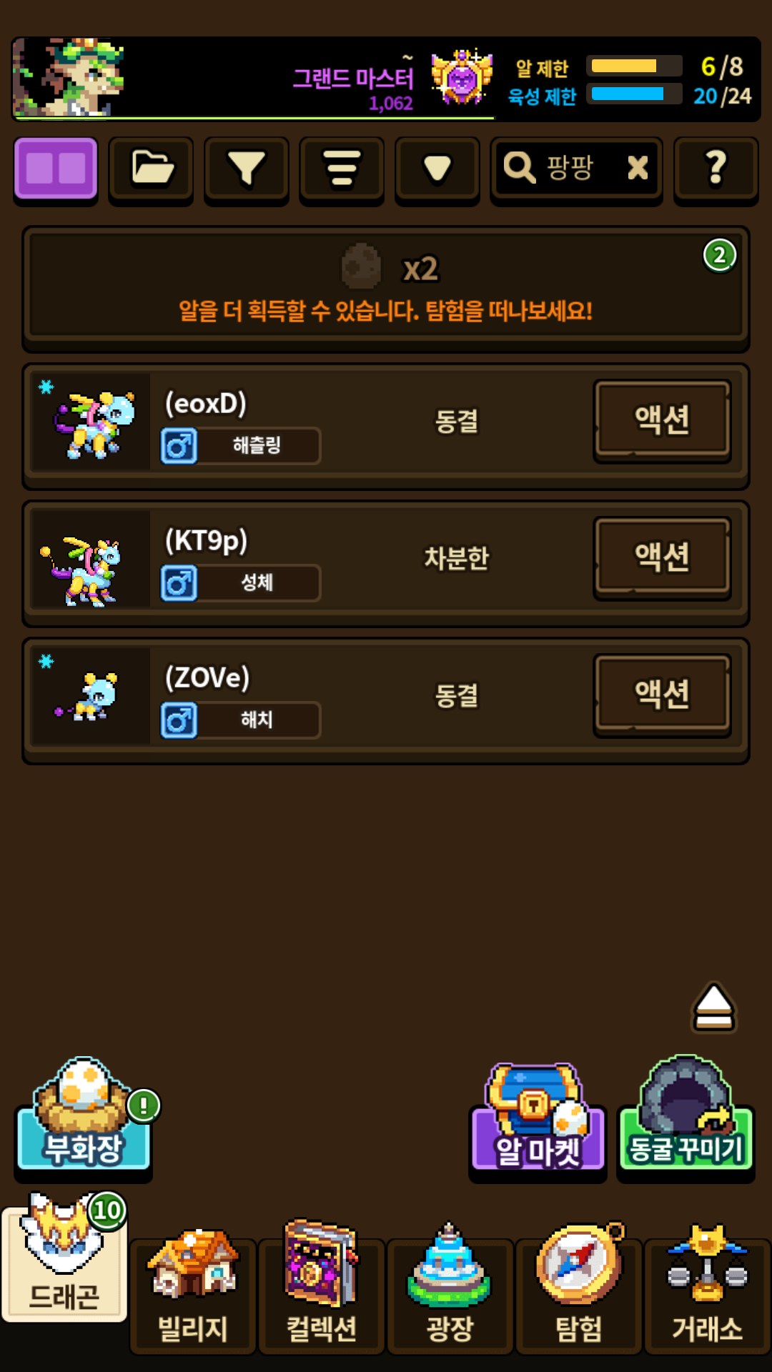 그 땐 동성 교배랑 이런 이벤트 생각을 못해서 그냥 해치 해츨링 성체 한 마리씩만 키웠지..ㅠㅠ