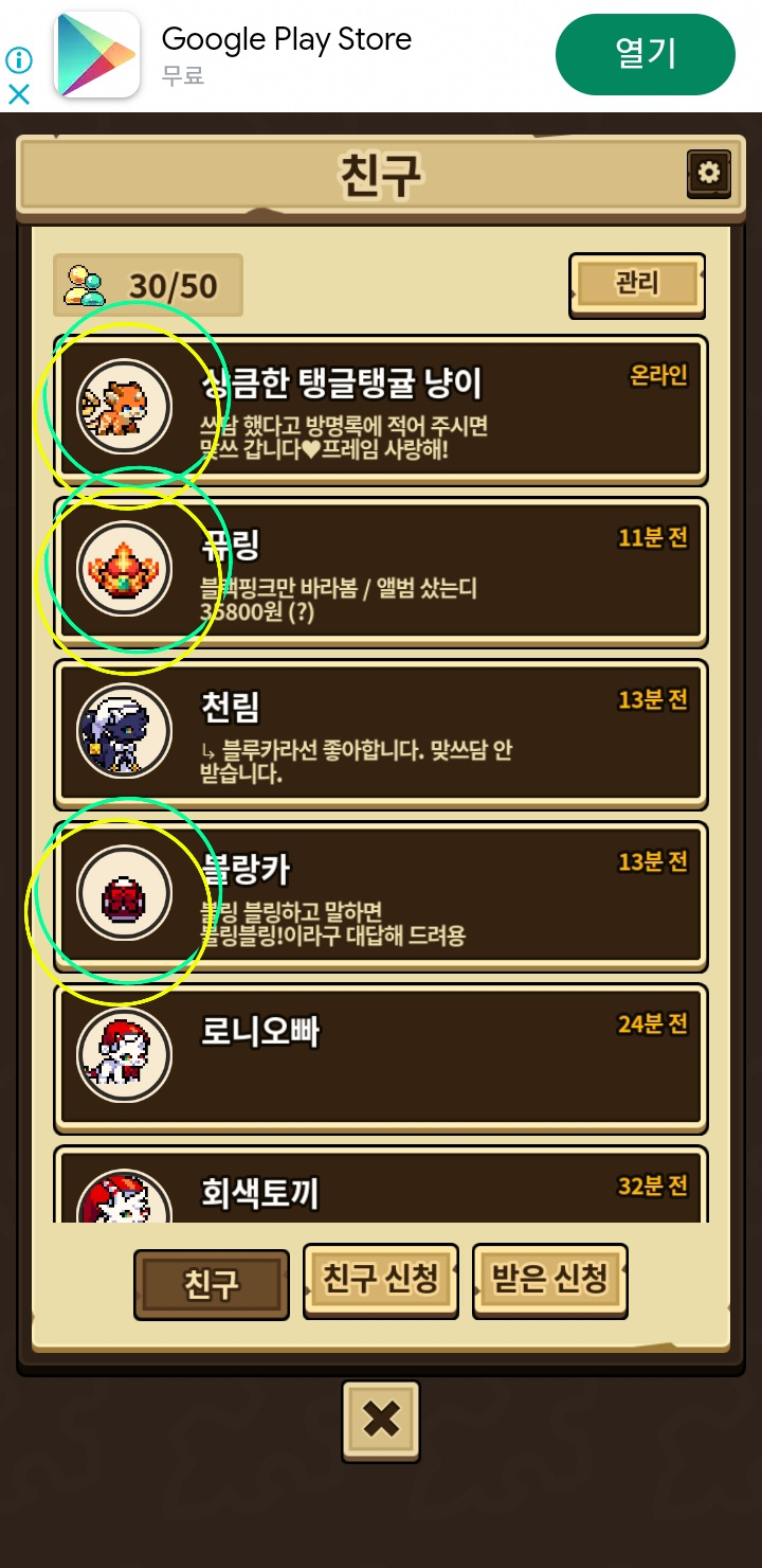 보시는 분들중 블랑카,퓨링,사큼한 탱글탱귤 냥이가 게임닉넴이시면 채팅에 남겨주세요.