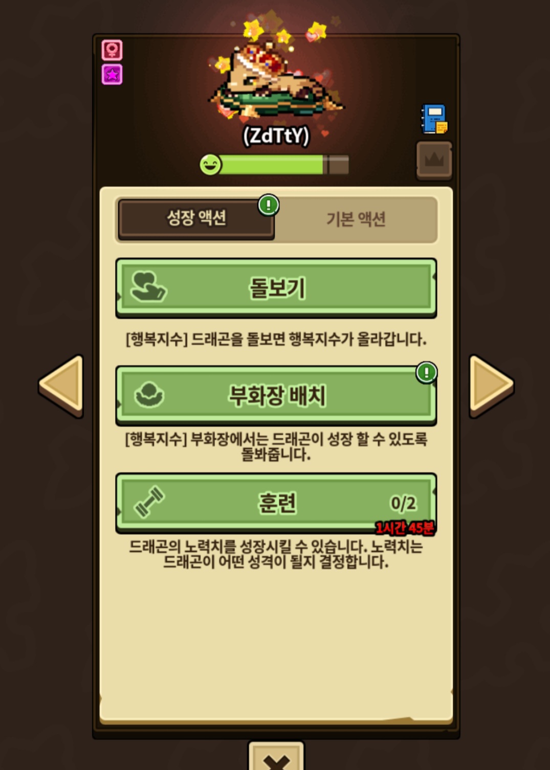 제가 기품작중인 용인데요.. 알상태일때 돌보기 4개하고 해치 되자마자 아무생각없이 나머지 2개돌보기를 해서 돌보기 게이지가 거의 만땅이 됐는데 저 상태로 6시간 넘게 안 내려가고있어요. 훈련이 5개나 남았는데 해결방법 없을까요? 계속 저상태로 있다가 해츨링되버리면 어떡하죠..